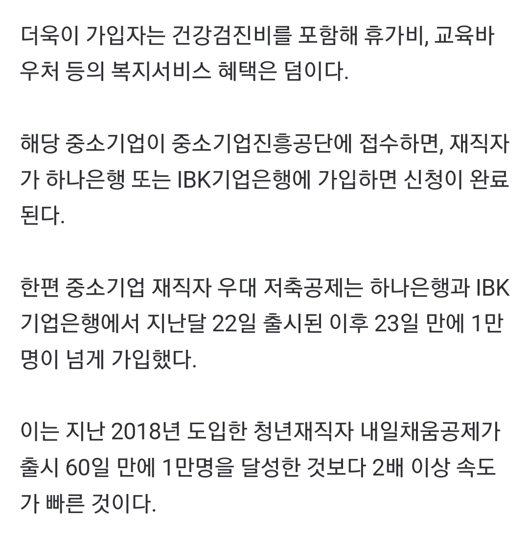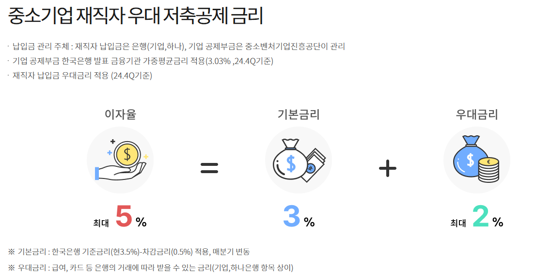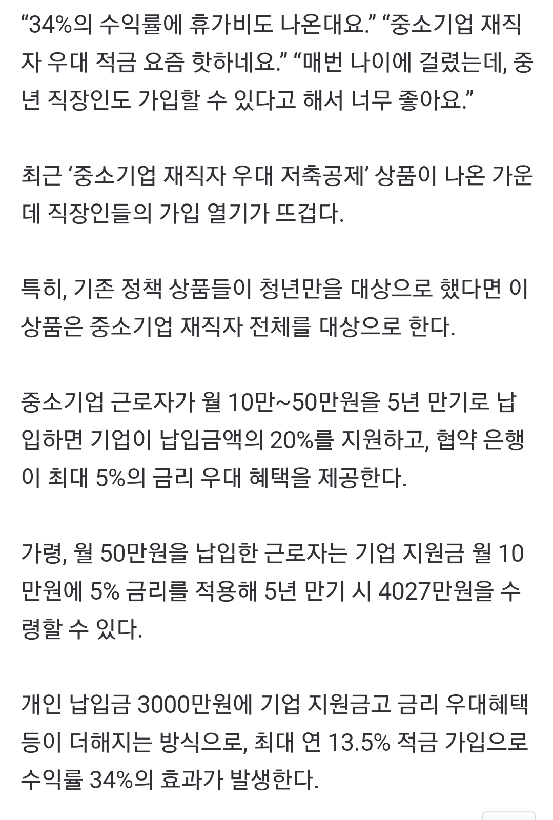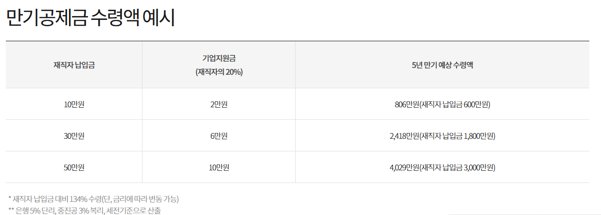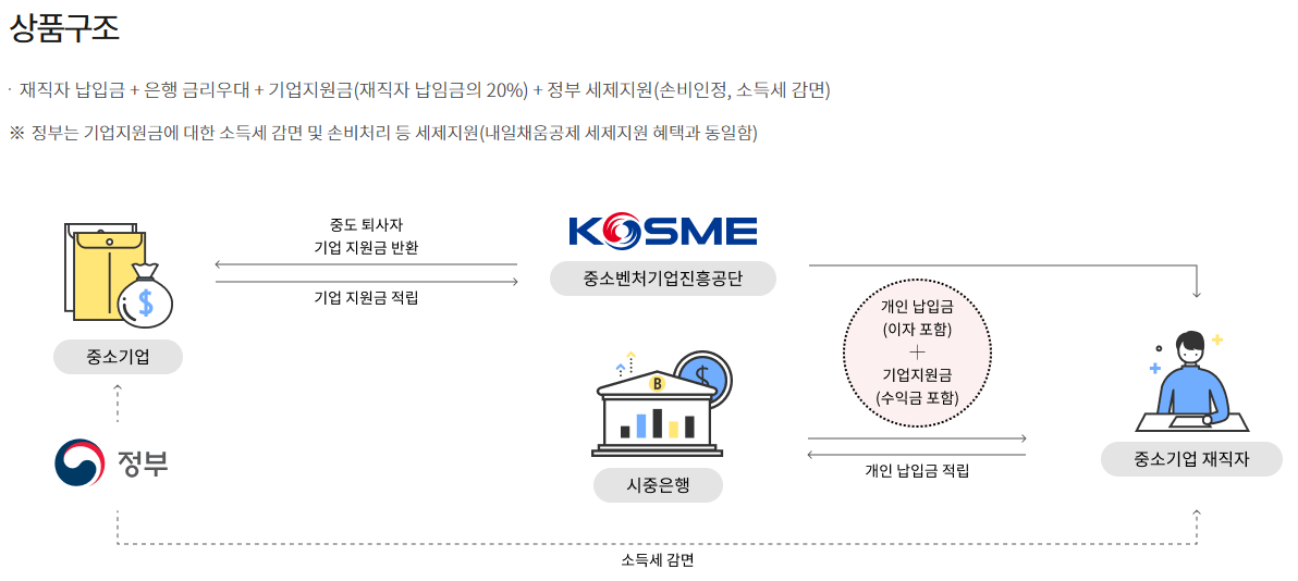 중소기업 재직자 우대저축공제라는 상품인데요. 중소기업 재직자가 월 최대50만원을 적립하고, 기업은 재직자 납부금의 20%를 지원하여 만기 시 재직자에게 전액 지급하는 상품입니다.