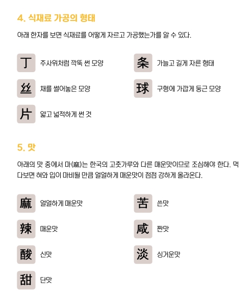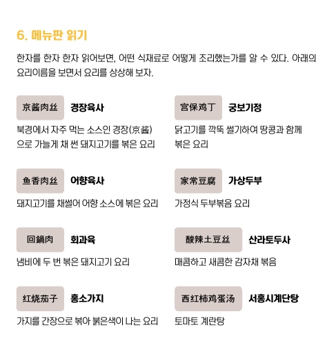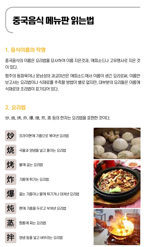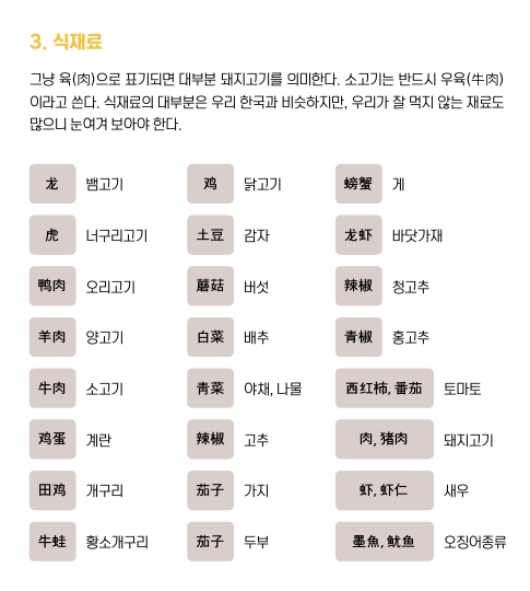 식당 메뉴판이 영어로 표시 된 곳도 있겠지만 대부분 중국어로 적혀있고 중국어로 보고 이해하는게 더 정확할 겁니다. 아래 내용은 중국 메뉴판 글자들의 기본적인 정보입니다.