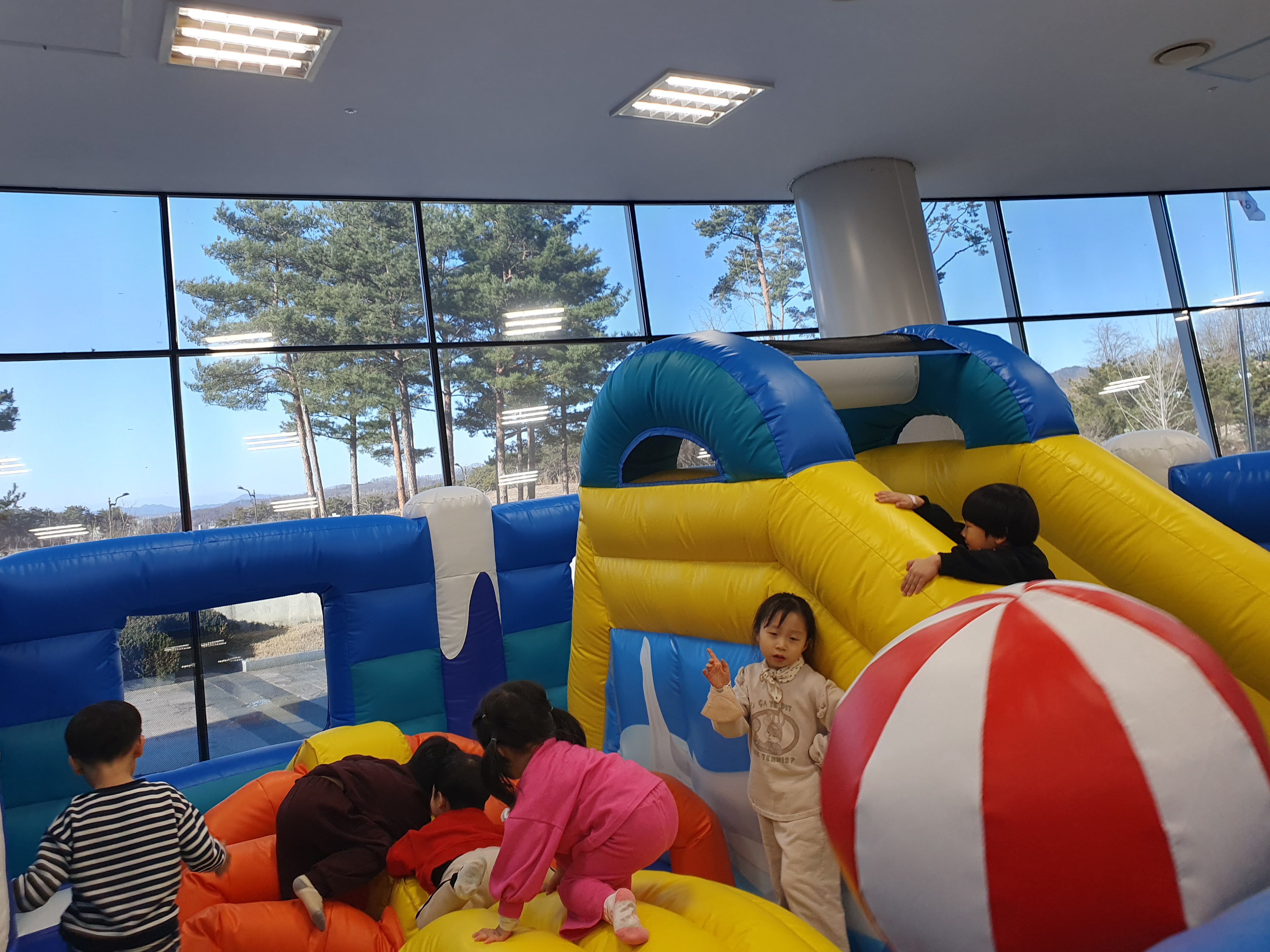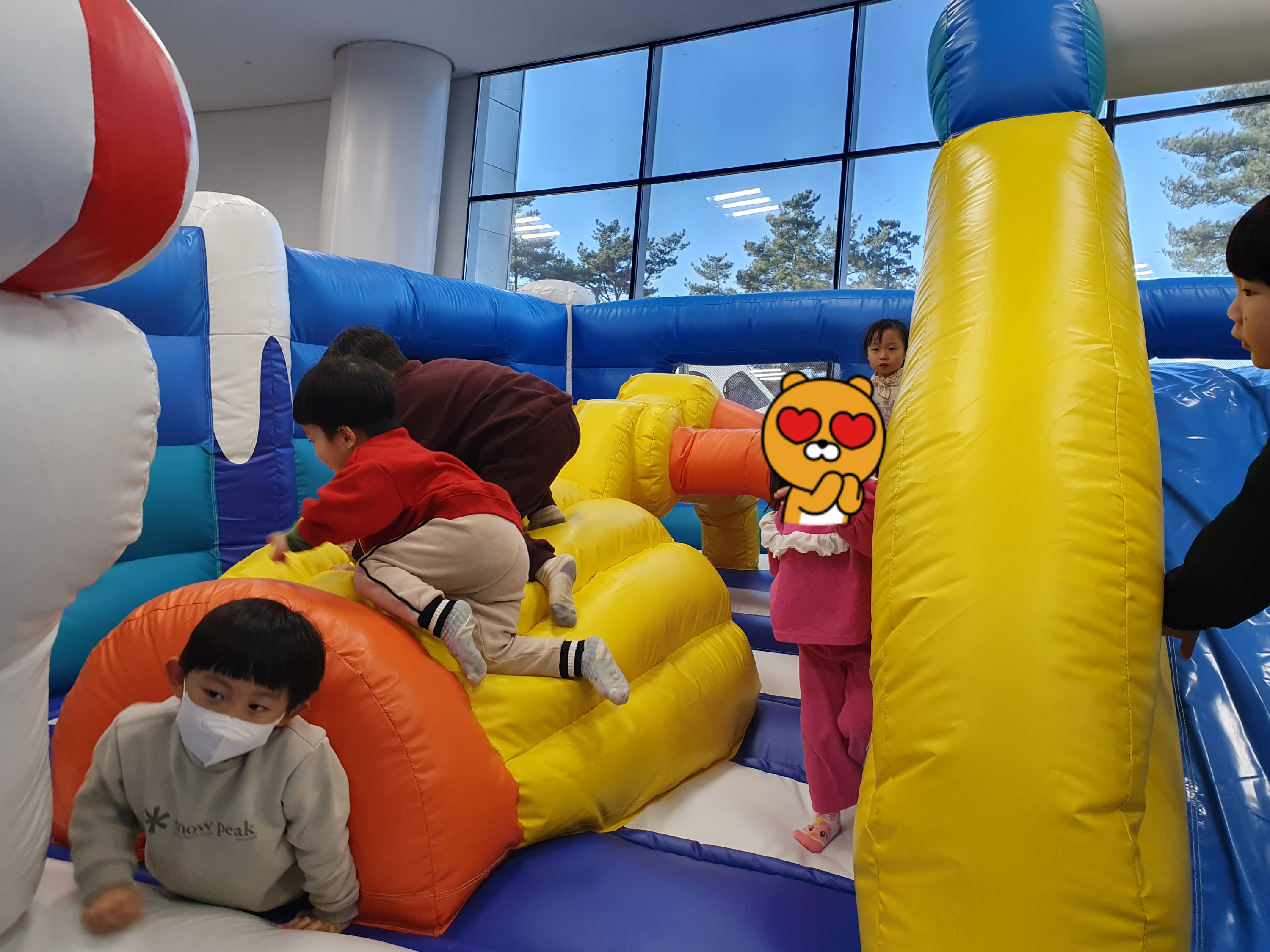 에어바운스 놀이터는 50명씩 입장 제한이 있어 사람이 많은 경우 줄을 서서 기다려야 합니다.