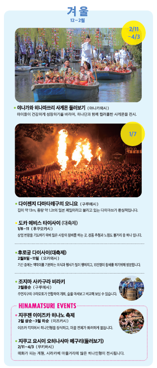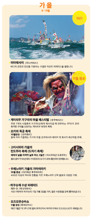 후쿠오카 축제는 봄부터 겨울까지 1년 내내 다양하게 진행됩니다. 그래서 취향에 맞게 원하시는 축제기간에 맞춰 여행을 계획하시면 더욱 즐거운 여행이 되실겁니다.