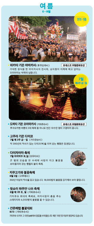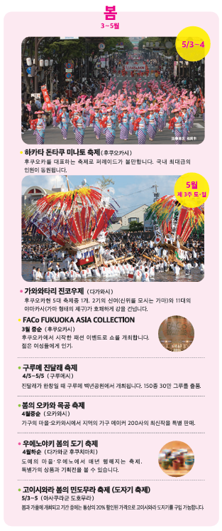 후쿠오카 축제는 부터 겨울까지 1년 내내 다양하게 진행됩니다. 그래서 취향에 맞게 원하시는 축제기간에 맞춰 여행을 계획하시면 더욱 즐거운 여행이 되실겁니다.
