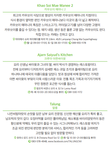 치앙마이(창푸악) 맛집 정보는 아래와 같습니다.