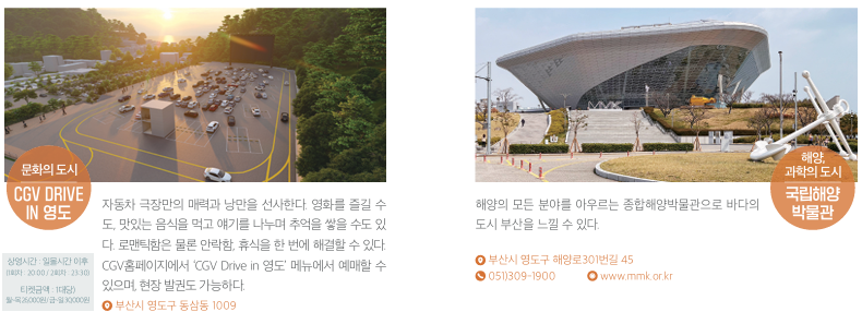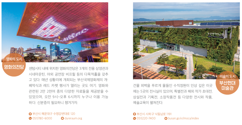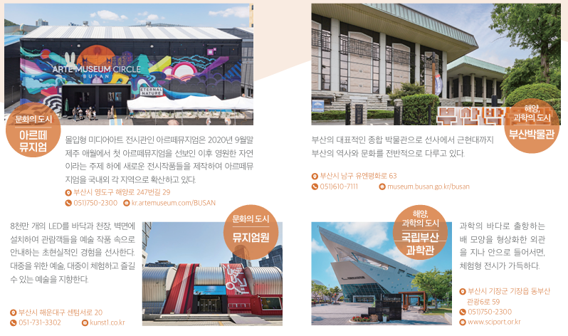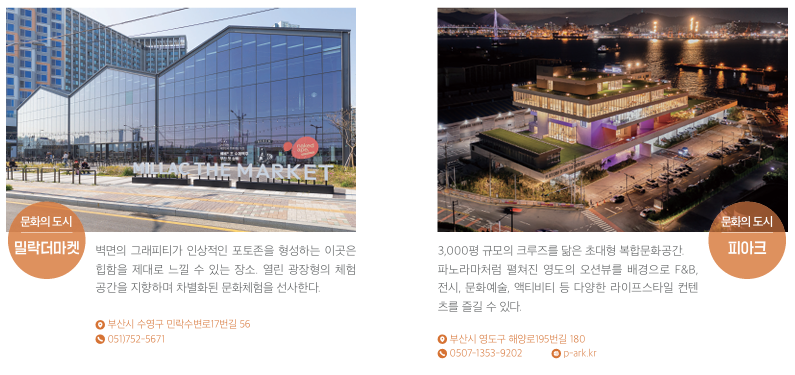 부산의 매력을 느낄 수 있는 여러 관광코스가 있지만 부산시에서 추천하는 부산의 문화를 마음껏 즐기고 느낄 수 있는 여행 코스는 아래와 같습니다.