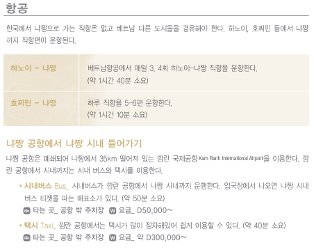 나트랑(냐짱) 방문시 항공, 기차 등 교통 정보입니다.(가이드북이 예전거라 우리나라에서 직항이 없다고 표시되어있는데 최근에는 직항이 생겨서 편하게 가실 수 있습니다.)