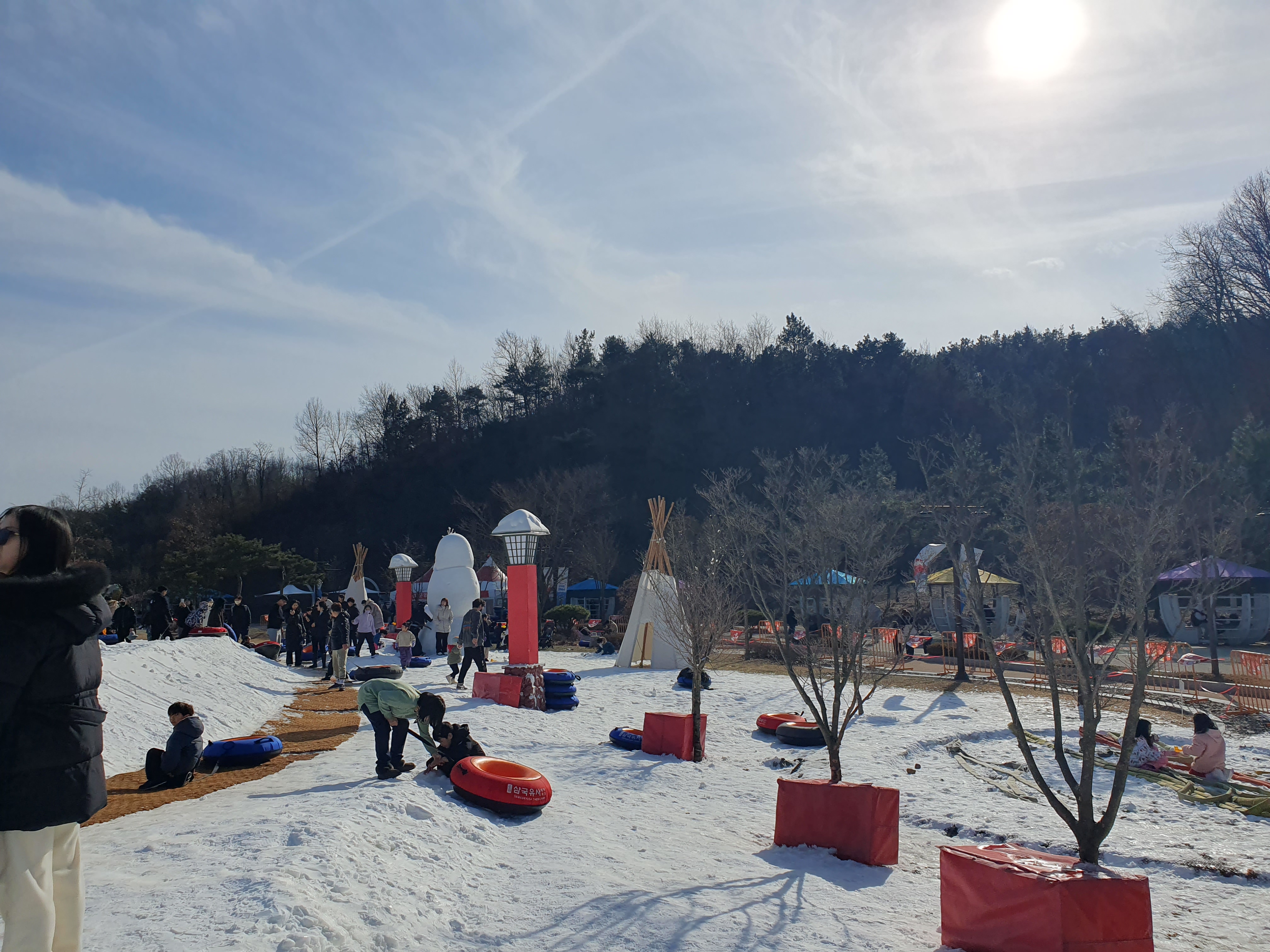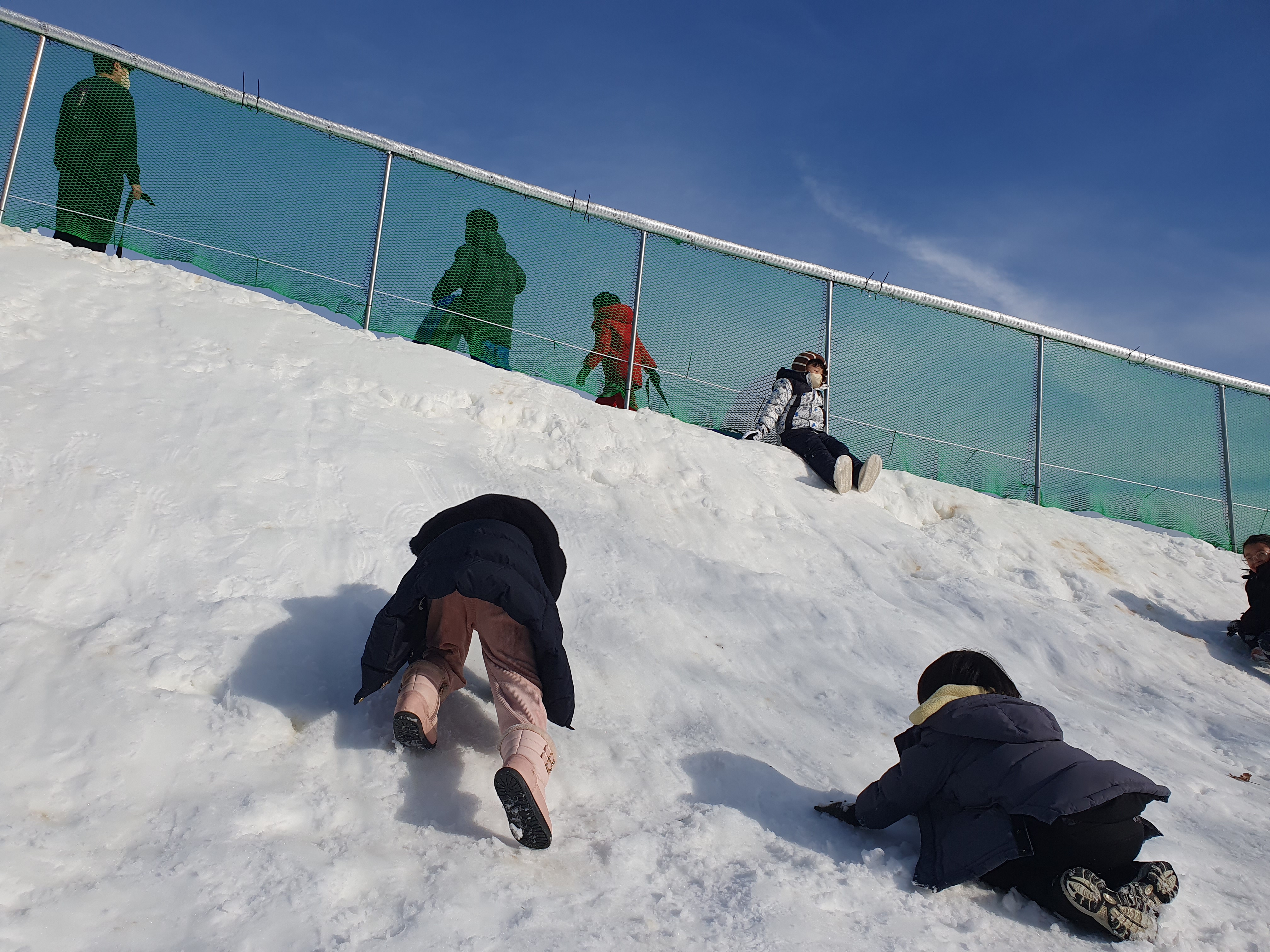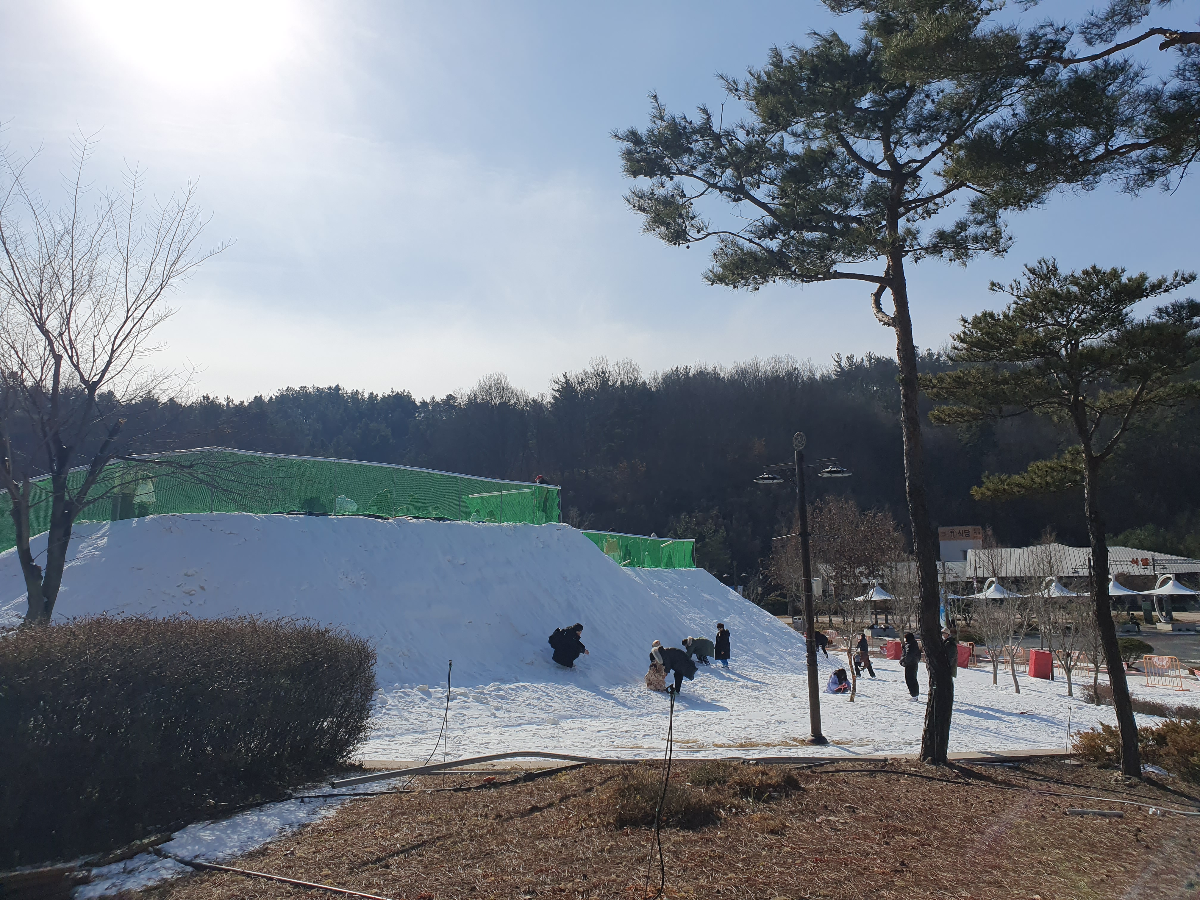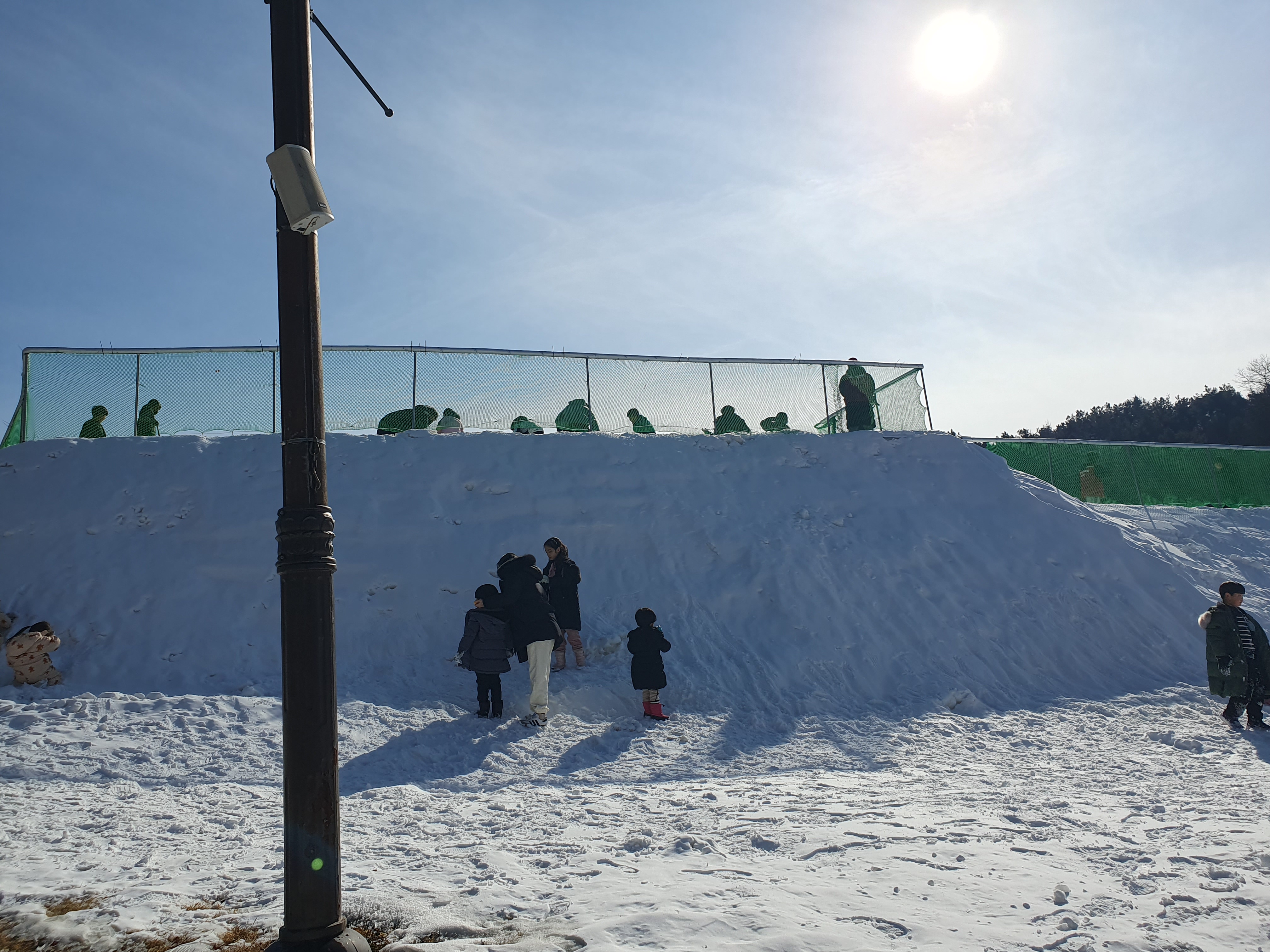 눈썰매장 앞뒤로 언덕에 눈이 쌓여있어 아이들이 썰매를 안타더라도 신나게 놀 수 있는 공간이 있습니다.