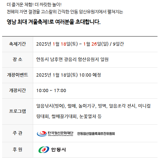 추운 겨울날 제대로 즐기시고 싶다면 안동 암산 얼음 축제에 가시길 적극 추천드립니다.