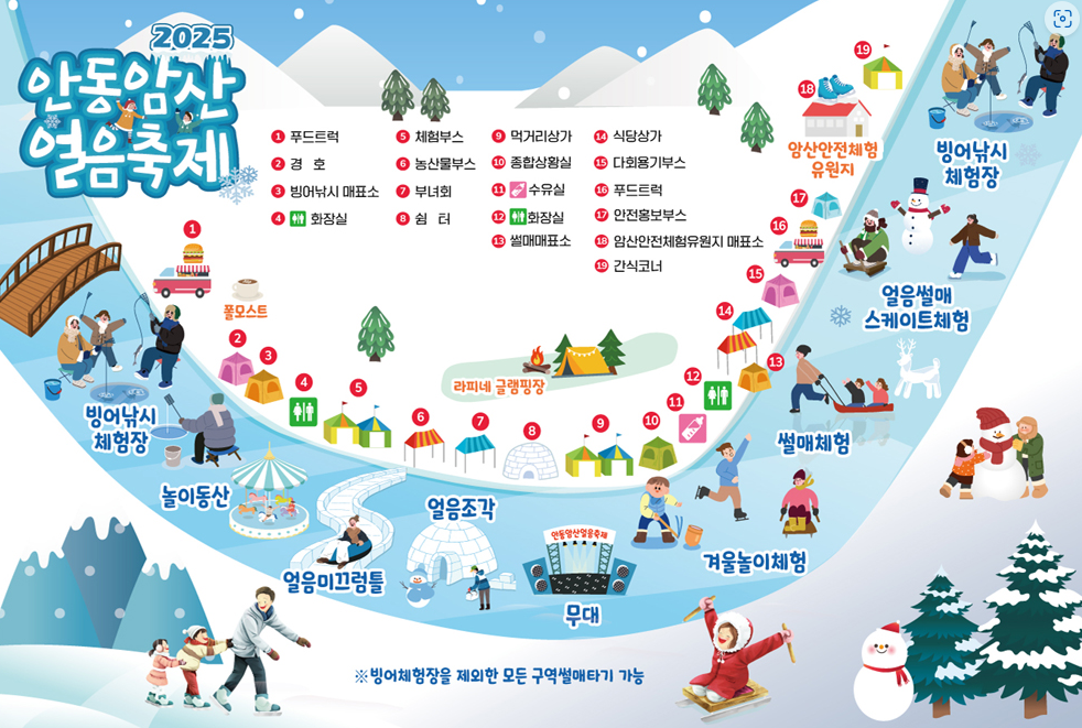 안동 암산 얼음축제 행사장 정보는 아래와 같습니다. 빙어장을 제외한 모든 장소에서 썰매를 탈 수 있다고 합니다.