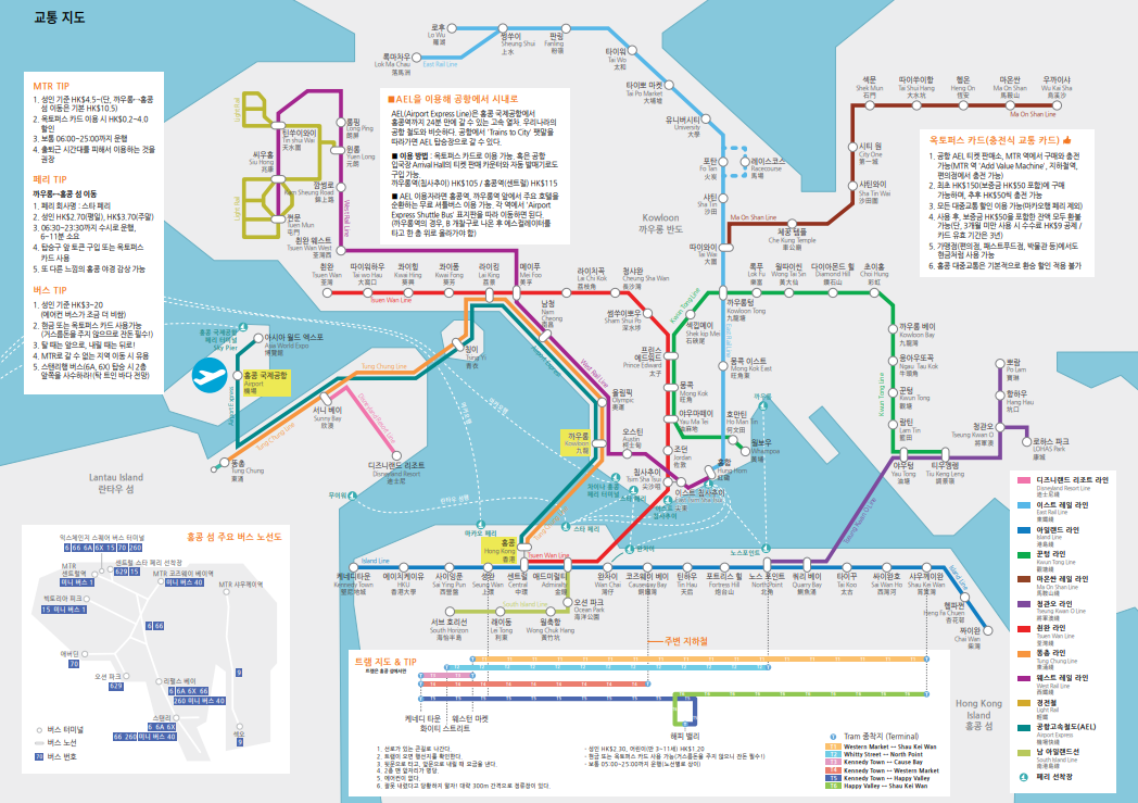 홍콩은 교통이 발달해서 대중교통을 이용해서 주요 관광지를 다 방문할 수 있습니다. 아래 교통 지도참고하시면 됩니다.