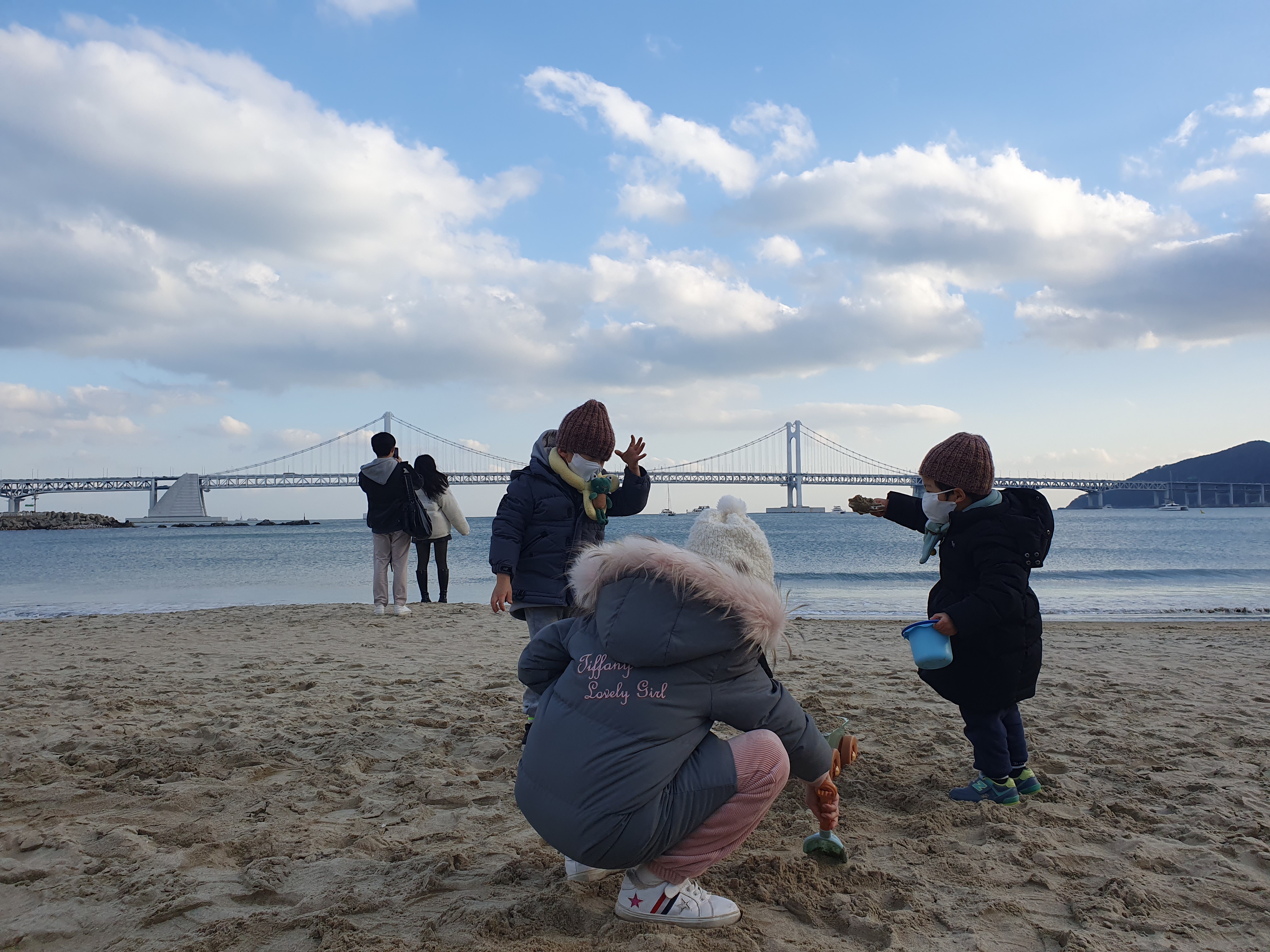 숙소에서 한참 구경후 광안리 해수욕장에 나와 모래놀이를 하며 시간을 보냈습니다.