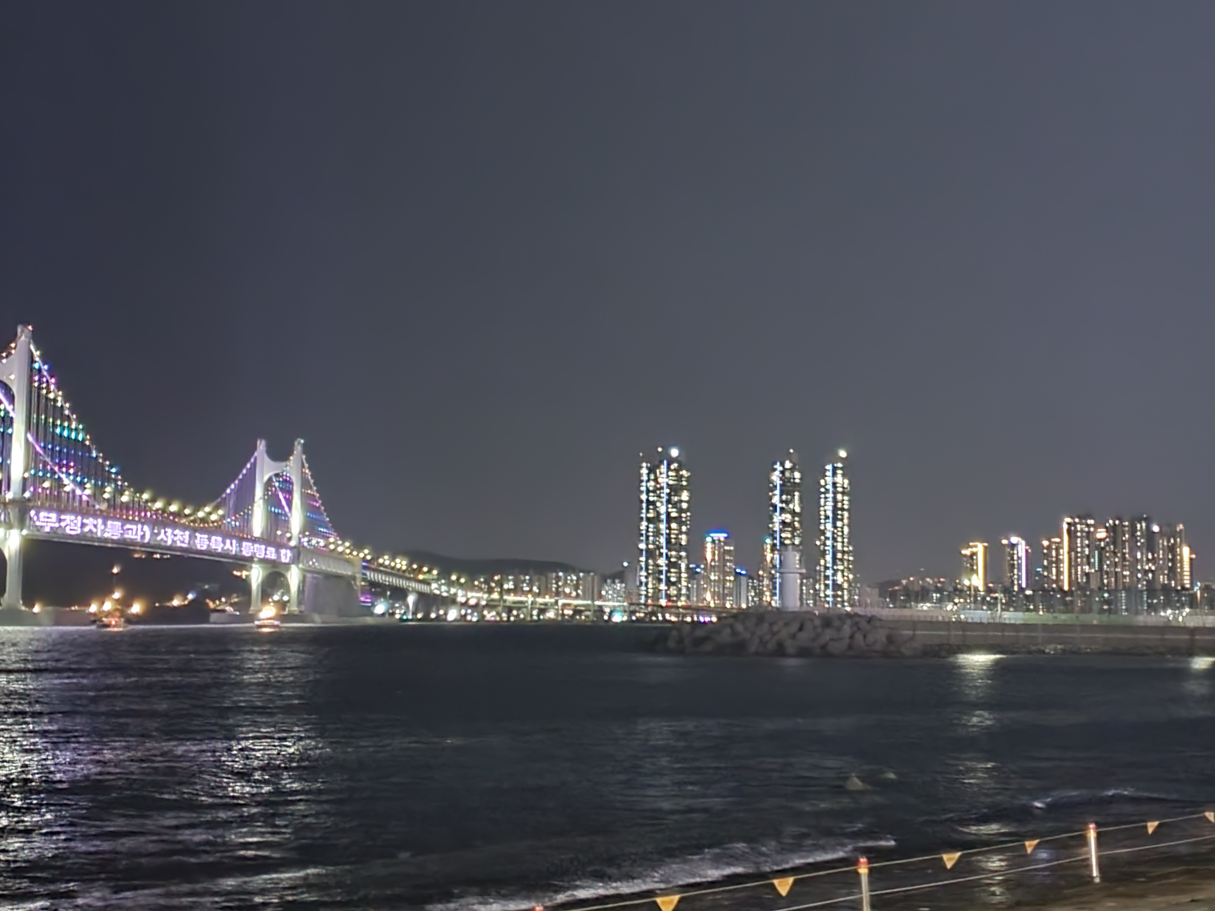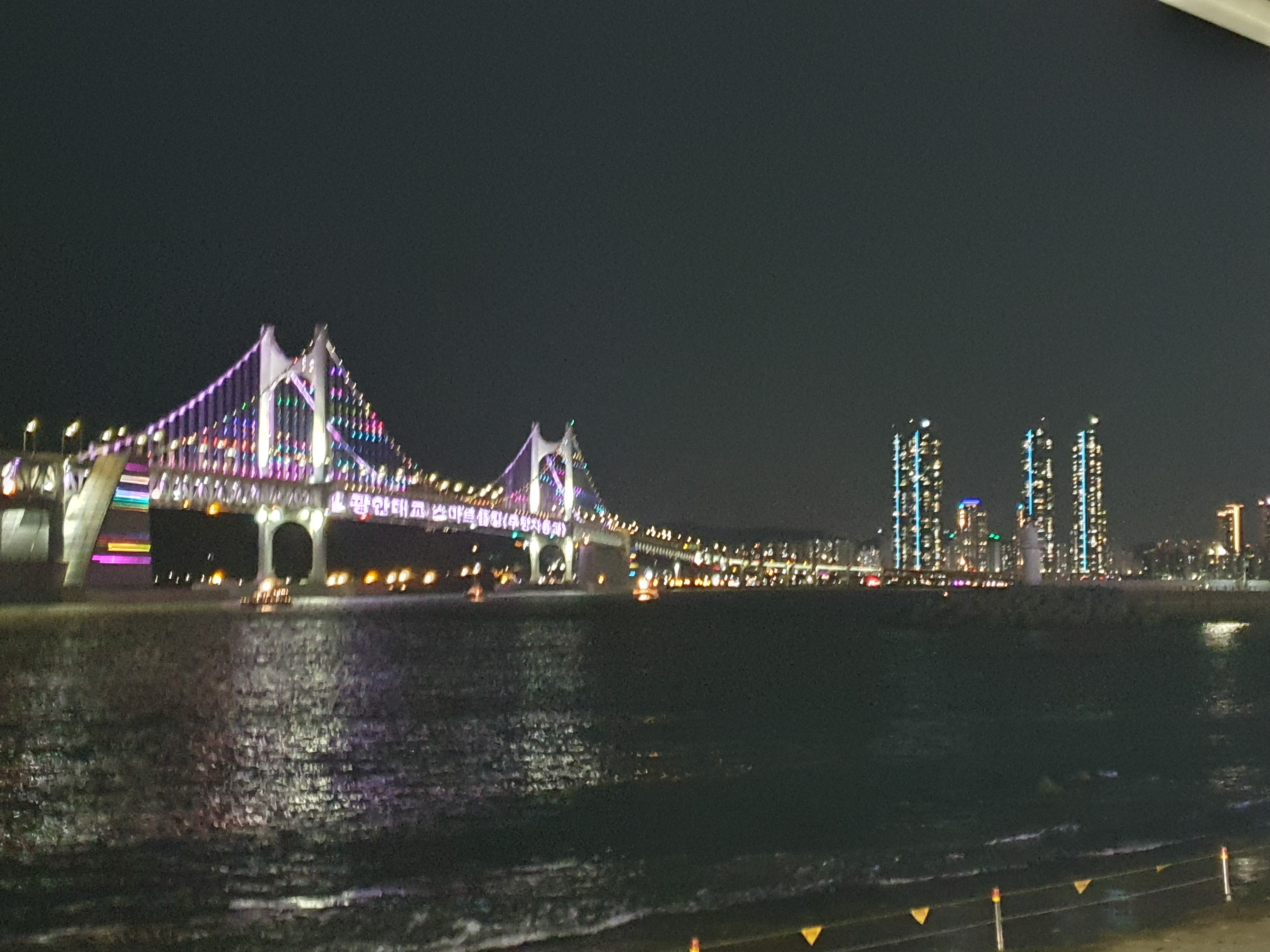 민락수변공원 바다 건너편으로 광안대교와 고층 빌딩의 불빛도 너무 아름다웠습니다. 민락수변공원 주변으로는 음식점과 고층 건물들이 많아 밤늦도록 불이 밝게 켜져 있습니다.