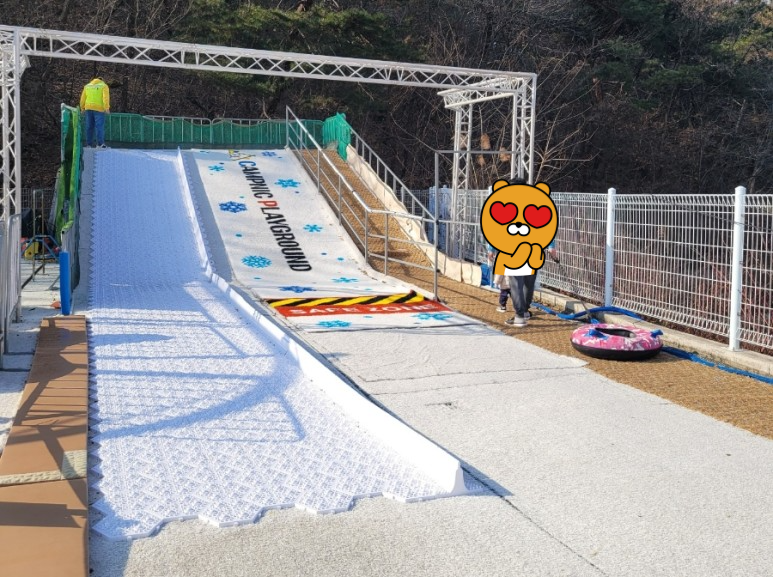 야외 시설중에 썰매를 탈 수있는 공간이 있어 아이들이 신나게 놀았습니다. 눈이 있는거는 아닌데 바닥이 미끄럽게 되어있어 눈설매를 타는 듯한 기분을 느낄 수 있습니다.