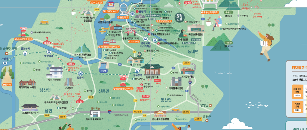 춘천은 강원도에 속하지만 수도권과 가까워 사람들이 많이 찾는 관광도시이기도 합니다. 아름다운 호수가 4개나 있어 호반의 도시라고 불리기도 합니다. 먼저 춘천시에서 제작한 춘천 관광지도