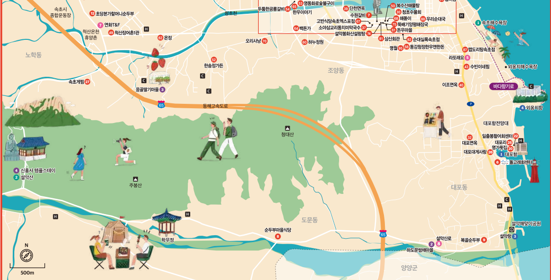 아래지도는 속초 주요관광지속초 주요음식을 알려주는 여행지도 입니다. 저희 가족은 속초까지 갈려면 4~5시간 정도 걸리지만 그러한 수고도 감수하면서까지도 자주 가는 편입니다. 그만큼 매력적이고 아름다운 도시인거 같습니다.