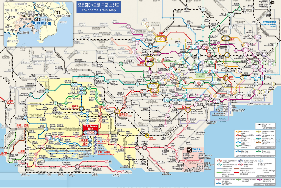 요코하마는 아래 지도에서 보이는대로 교통이 거미줄처럼 촘촘하게 연결되어있습니다.