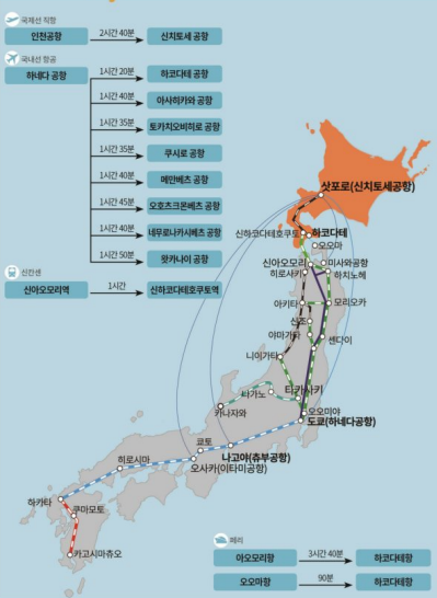 우리나라에서 홋카이도 까지는 비행기로 2시간 40분 정도 걸려 단기로 여행하기에 부담이 없기도 합니다.
