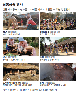 위에서 말씀드린것처럼 한국민속촌에서는 여러 전통 문화 체험 활동과 공연을 관람하실 수 있습니다.