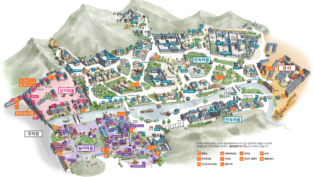 아래 한국민속촌 지도보면 아시겠지만 다양한 놀이시설과 체험장소가 있습니다. 한국민속촌 여행시 아래 지도를 참고하시기 바랍니다.