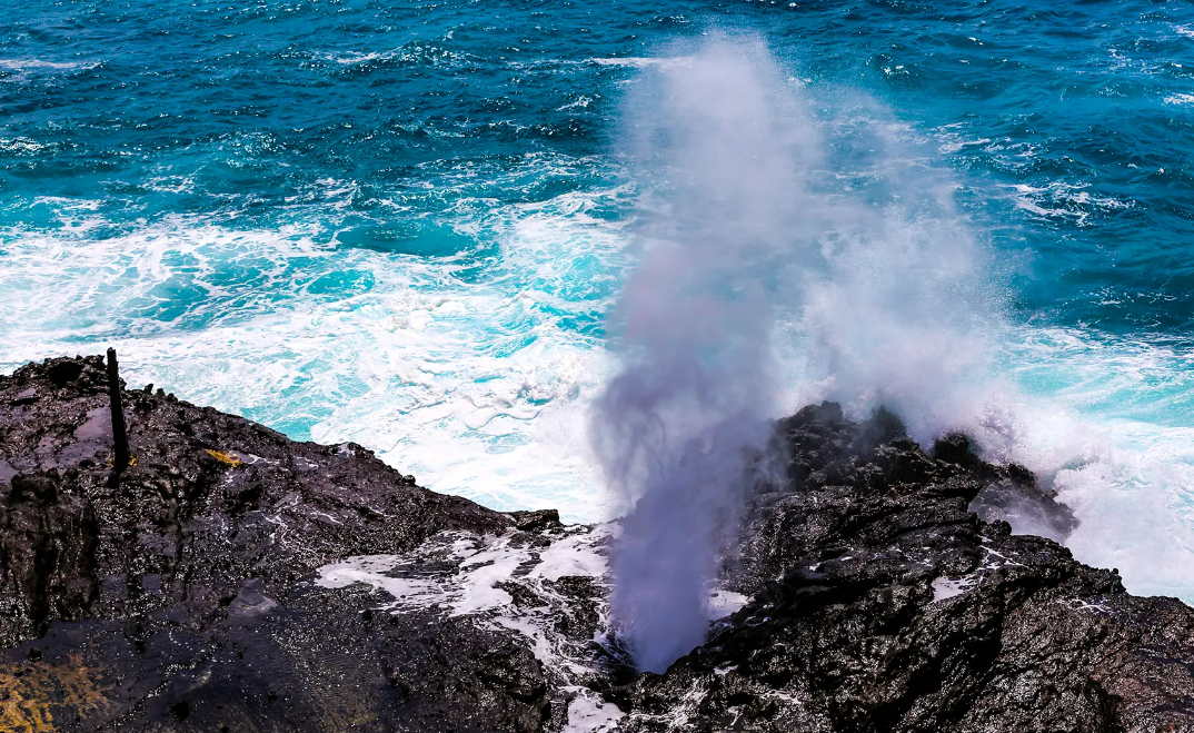 동쪽 바다가 보이는 파도가 몰아쳐 바위홀이 생겨 위로 바닷물이 솟아 치고 겨울철에는 알라스카에서