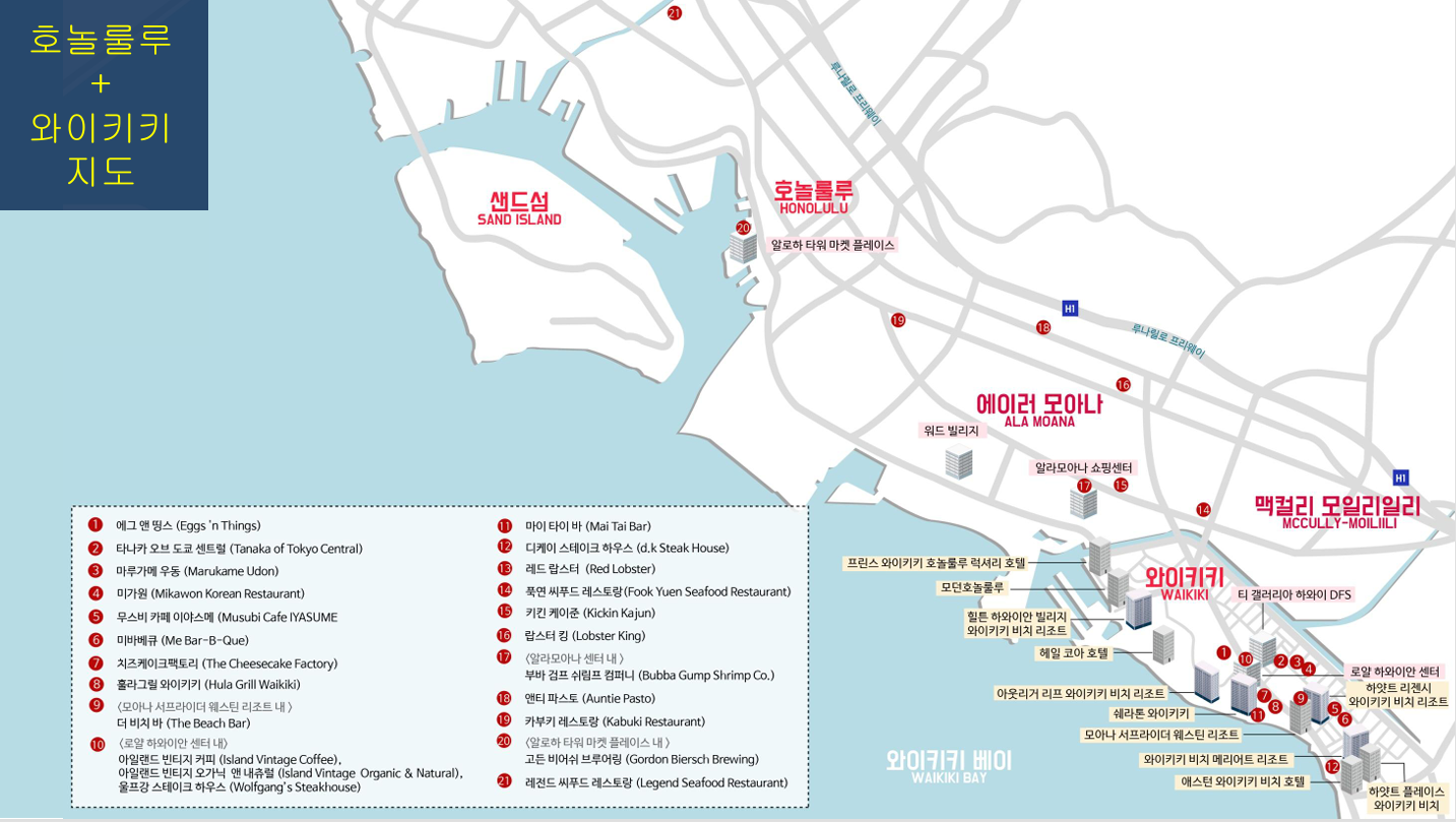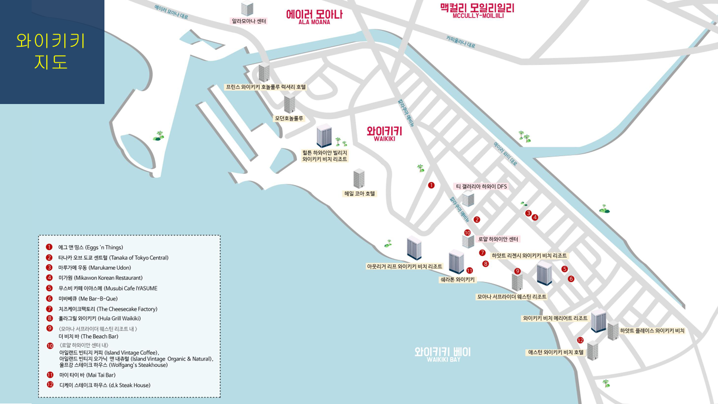 하와이를 대표하는 호놀룰루와 와이키키 지도입니다.