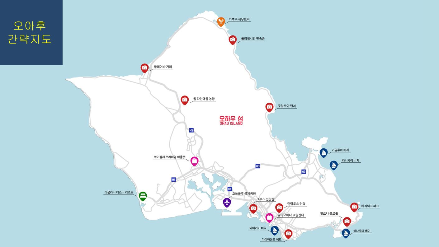 오아후 섬 주요 관광지를 나타내는 지도는 아래와 같습니다.
