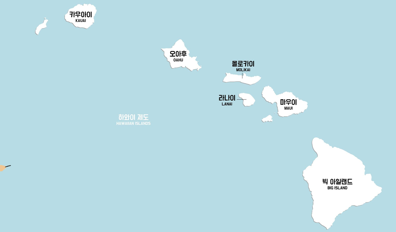 하와이는 19개의 섬과 환초로 이뤄져 있는데 가장 큰섬이 하와이여서 전체섬을 하와이로 통칭하고 있습니다.
