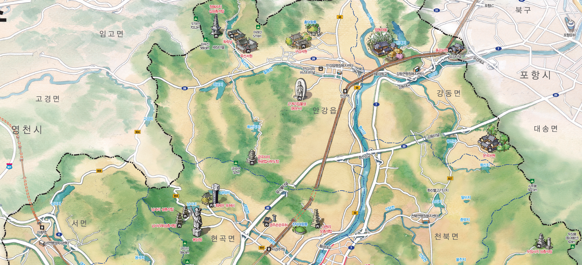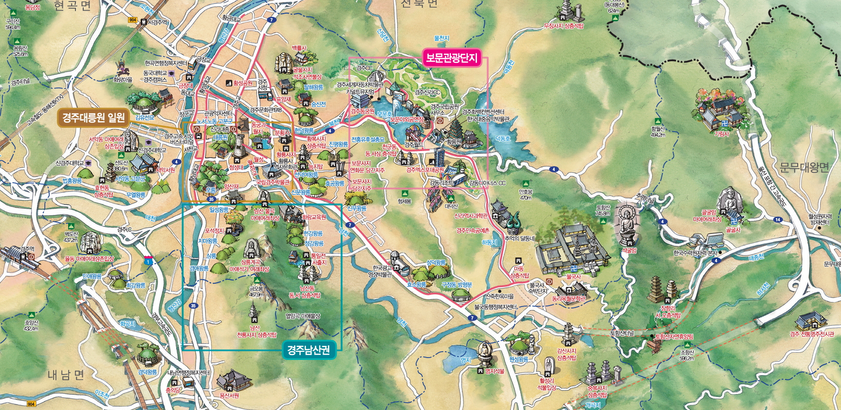 경주 중심지에 대표 관광지인 보문관광단지, 첨성대 등이 있습니다.