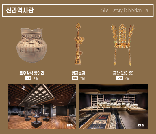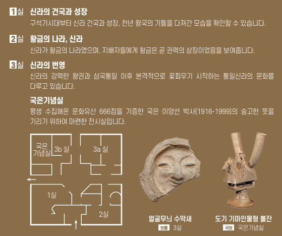 경주국립박물관 전시실 실별로 시간의 순서대로 유물들이 전시되어있습니다.
