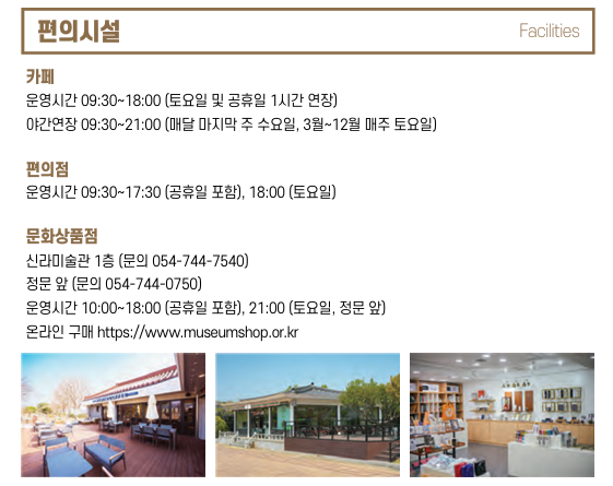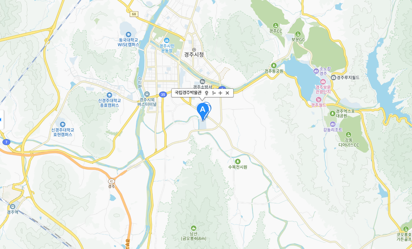 경주국립박물관경주시내에 위치하고 있어 박물관을 구경하고 다른 관광지를 가기 좋습니다.(주소:  경북 경주시 일정로 186)