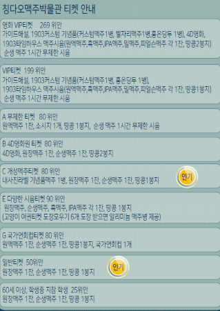 칭다오 맥주박물관 티켓 가격은 아래와 같습니다.