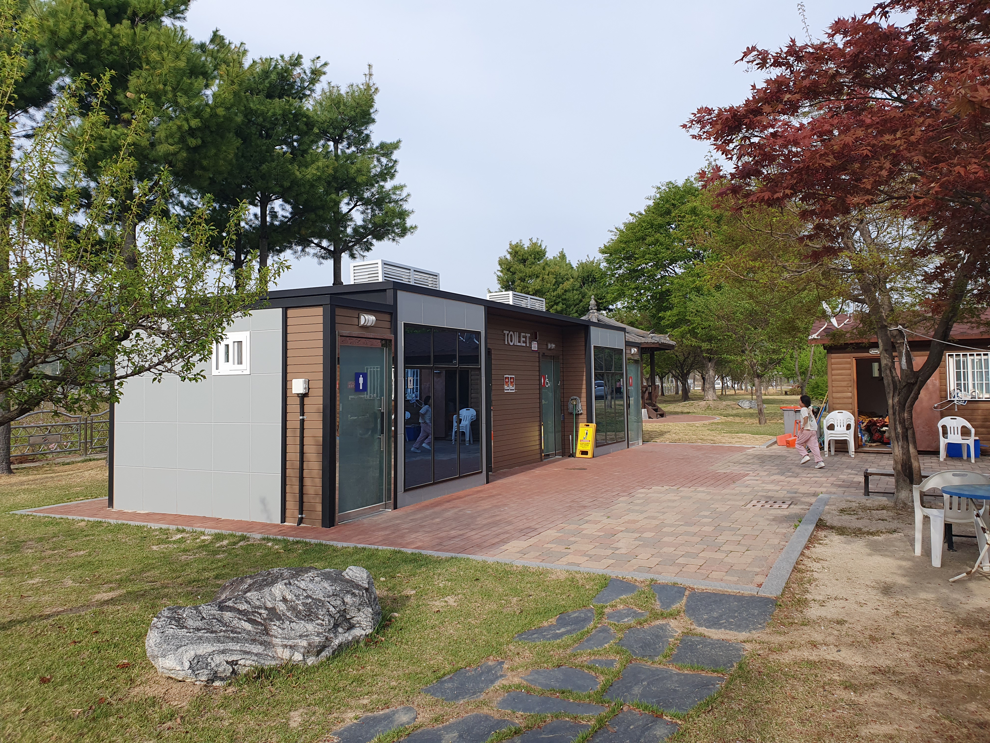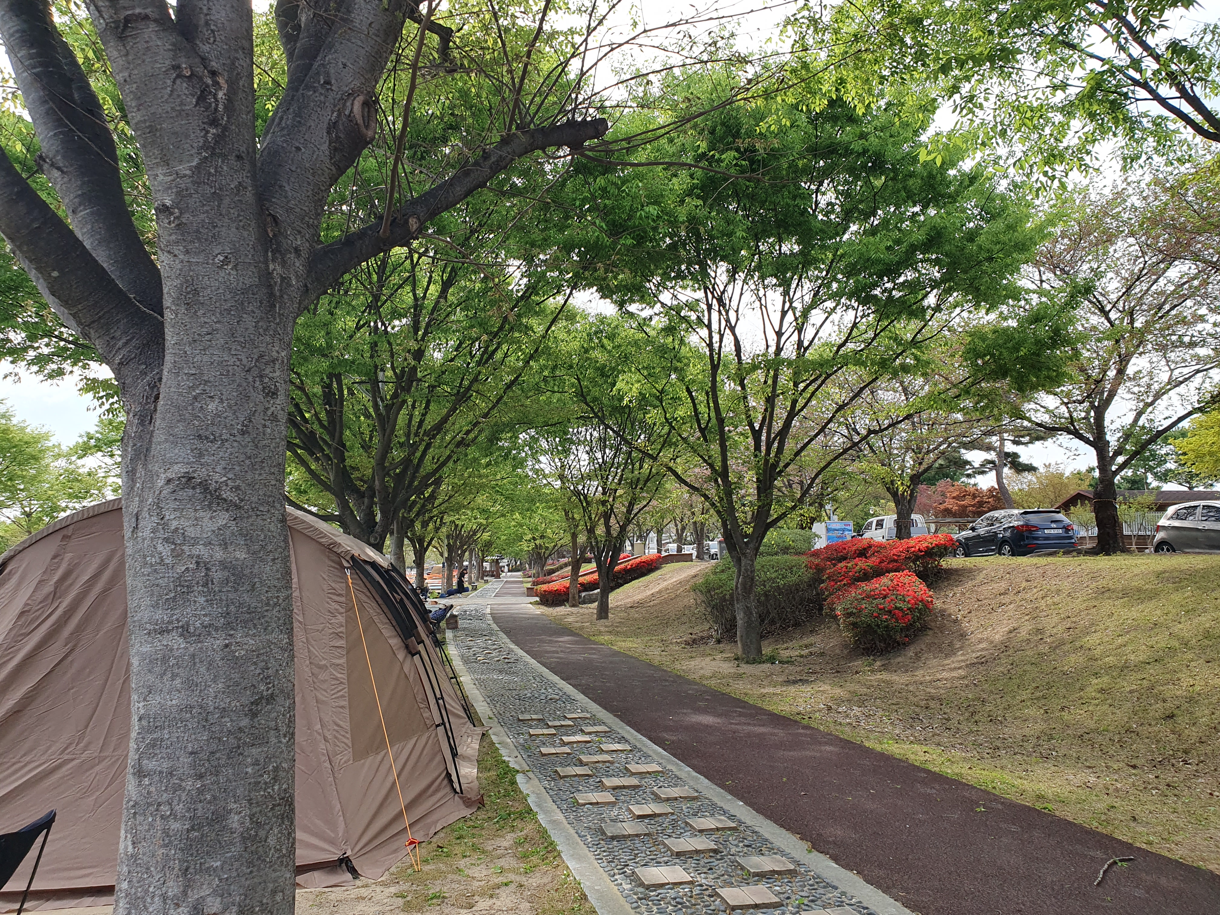 임고강변 캠핑장은 넓은 잔디 밭과 아름다운 나무들이 잘 가꾸어져 있어 관리가 잘 되고 있는 듯한 느낌을 받았습니다. 실제로 관리사무실도 바로 옆에 있고 관리하시는 분들이 청소를 하고 계시는 모습도 보았습니다.