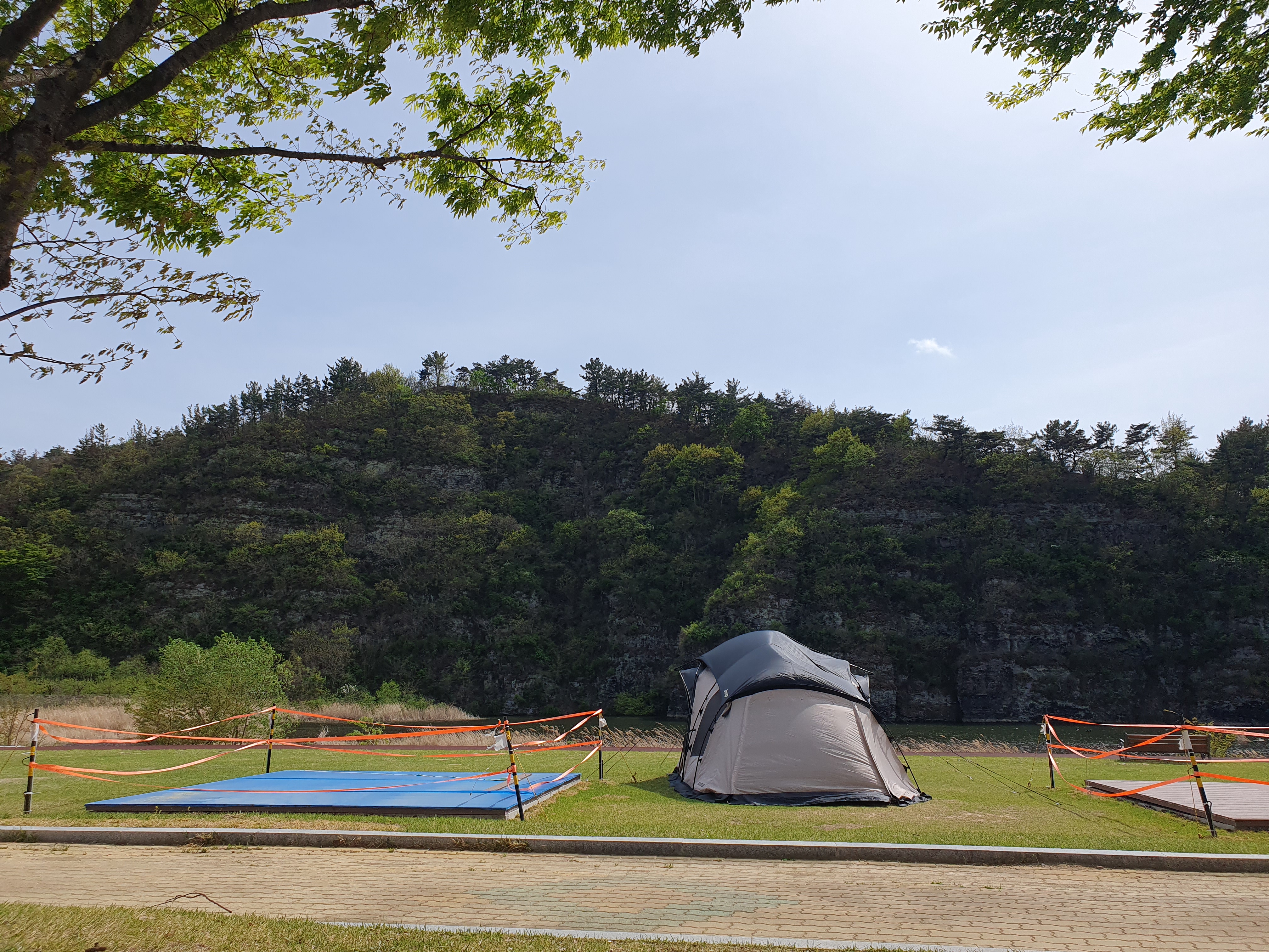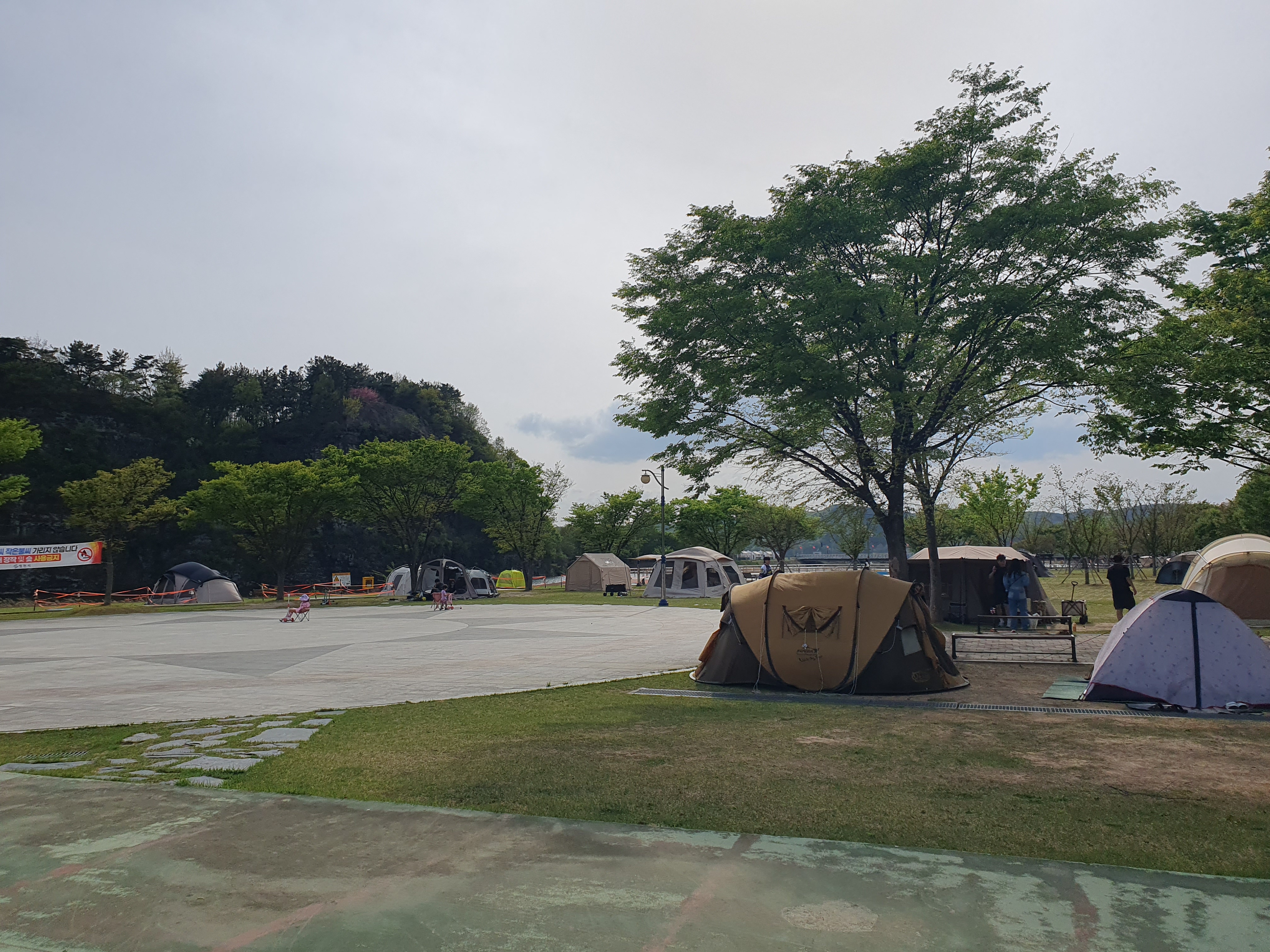 캠핑장 곳곳에 저희 처럼 텐트를 치고 맛있는 음식을 먹으며 즐기고 있는 분들이 많았습니다. 참고로 임고강변 캠핑장은 취사가 되긴하는데 요즘 산불때문인지 숯이나 장작으로 요리를 하는것은 금지하고 있습니다.