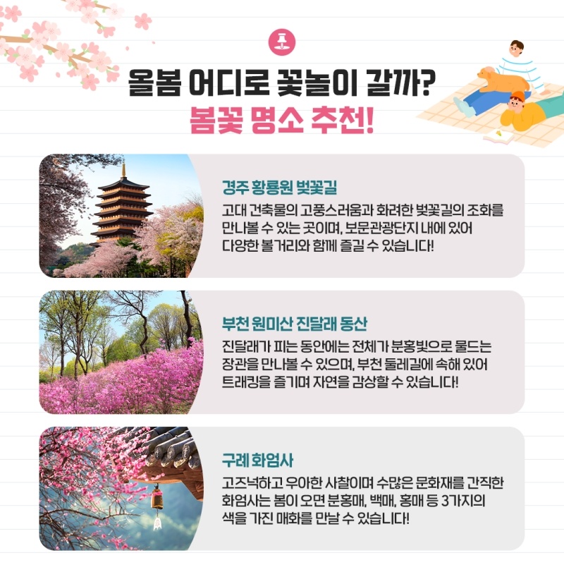 전국적으로 많은 봄꽃 명소가 있지만 대표적인 곳으로 경주 황룡원 벚꽃길, 부천원미산 진달래동산, 구례화엄사를 추천드립니다.