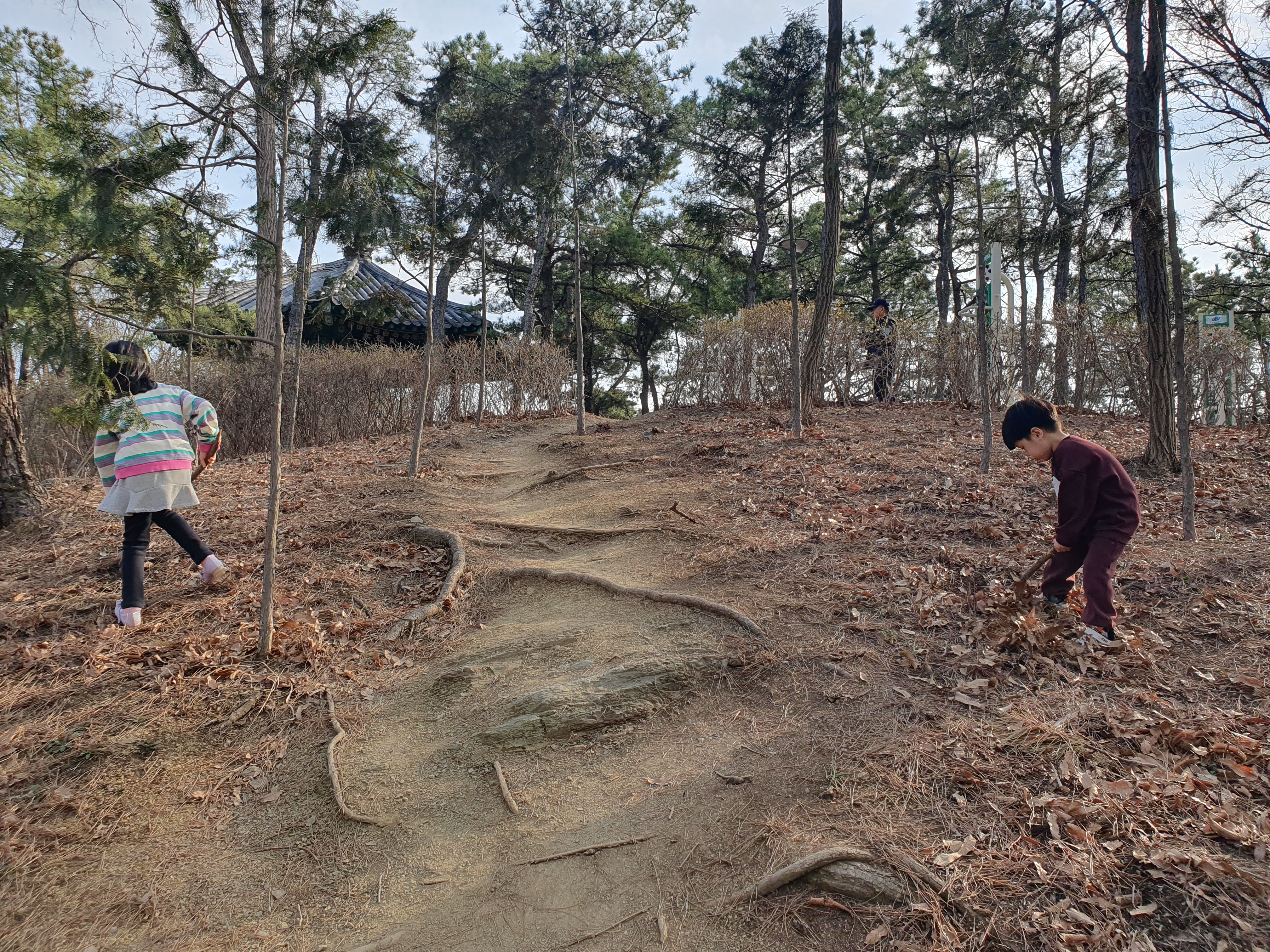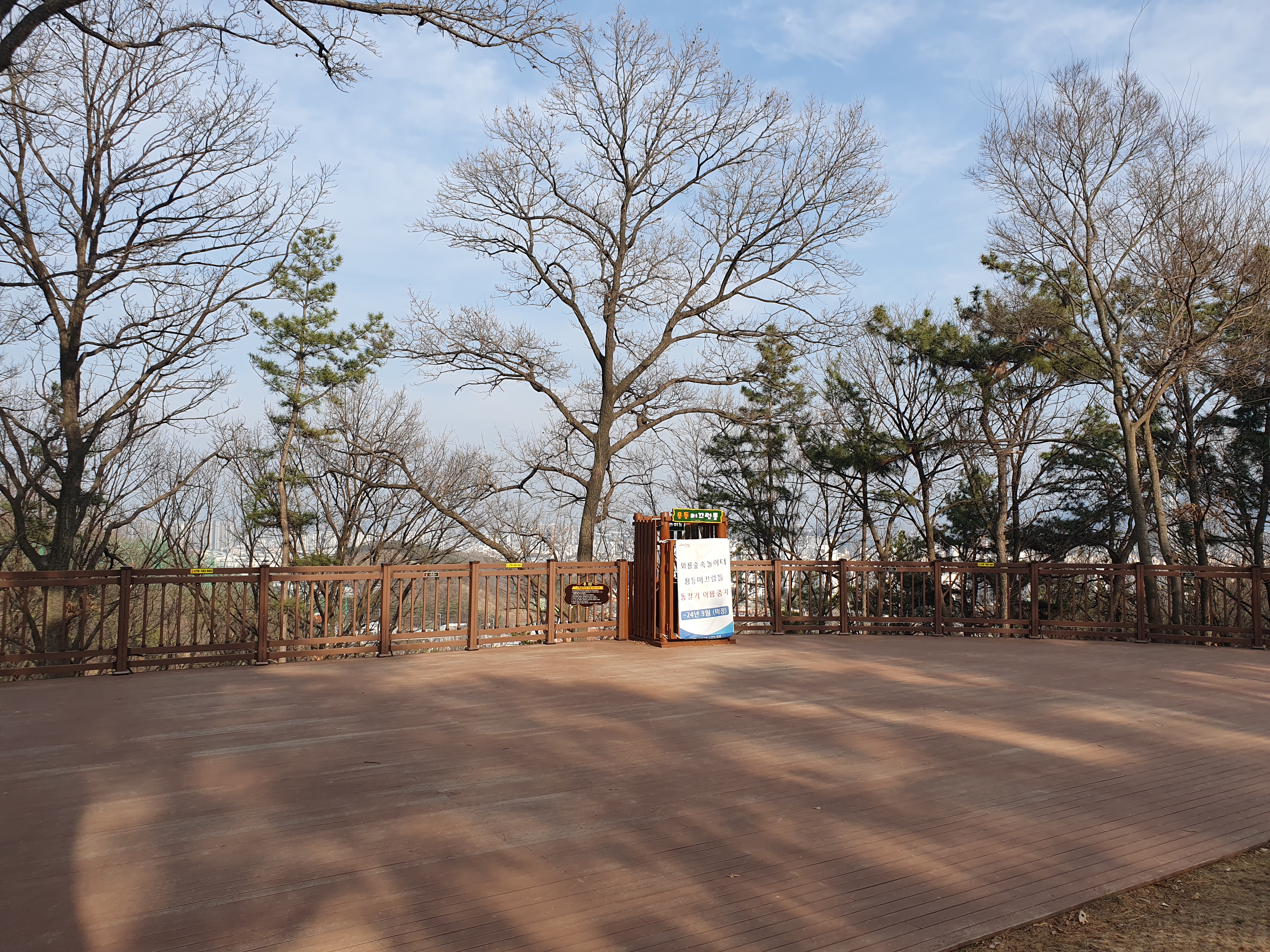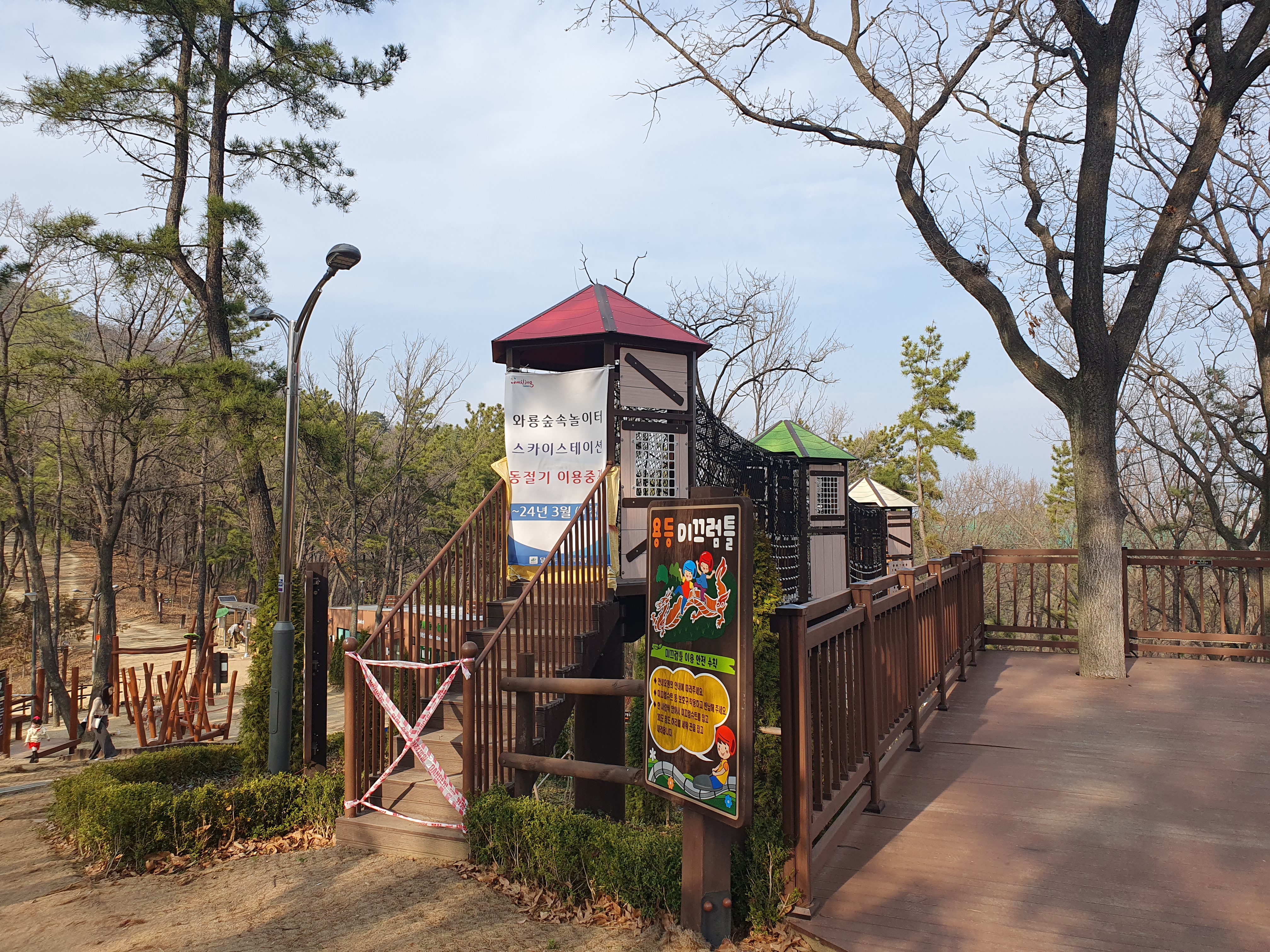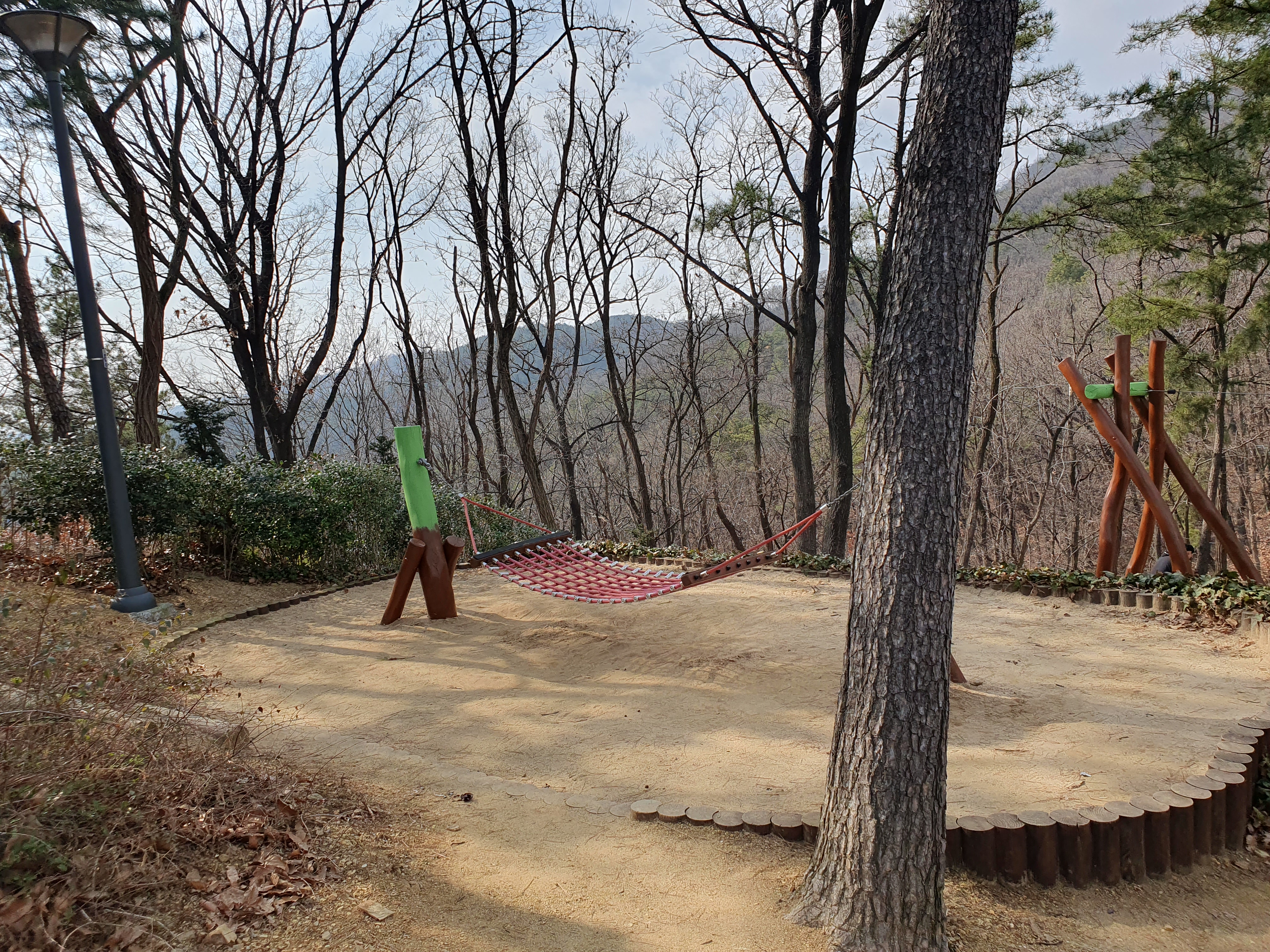 등산로를 올라 산 중턱에 가면 놀이터가 보입니다. 놀이기구가 다 나무로 되어있고 지금도 놀이시설 설치 공사가 진행 중이었습니다.