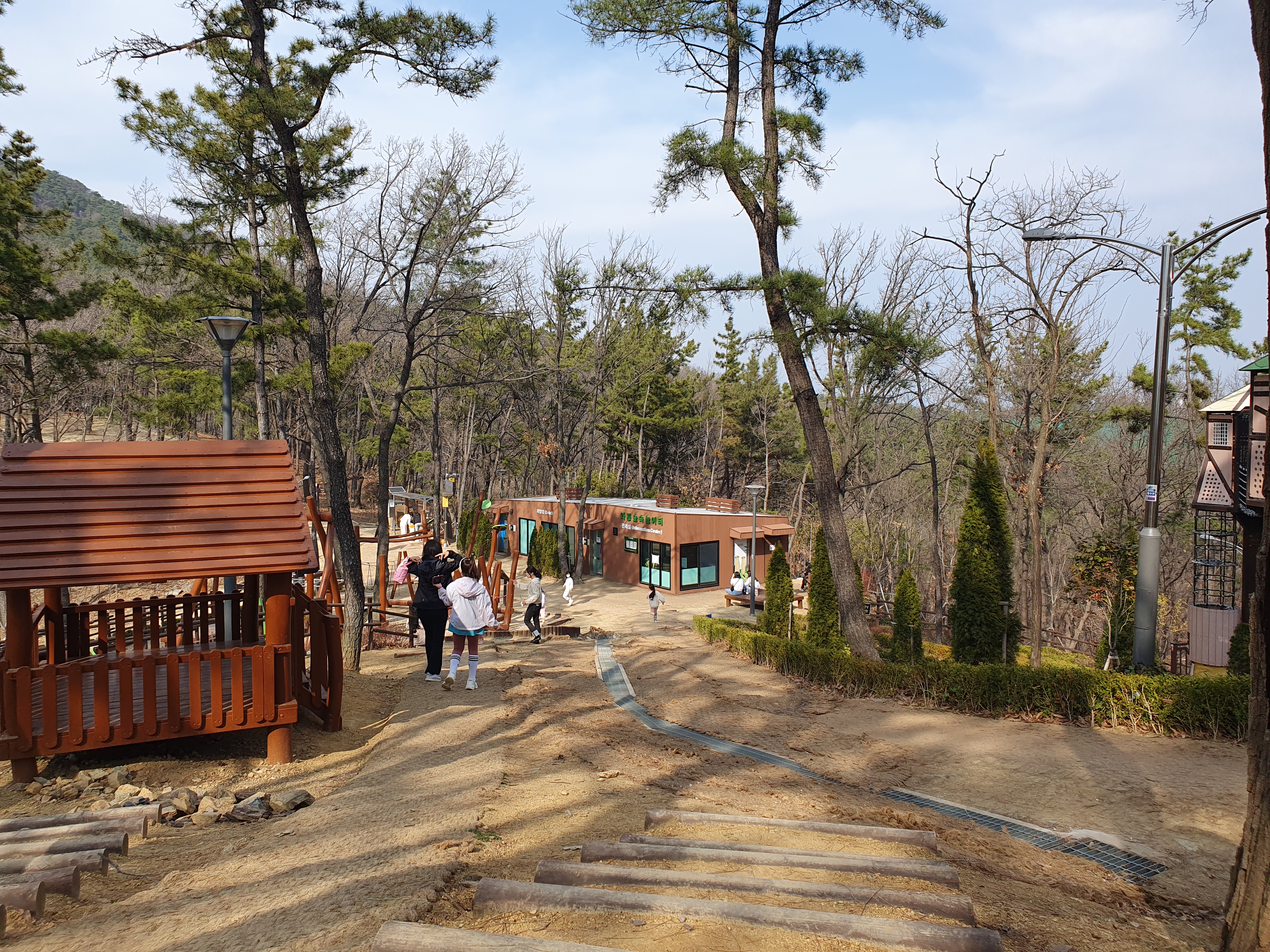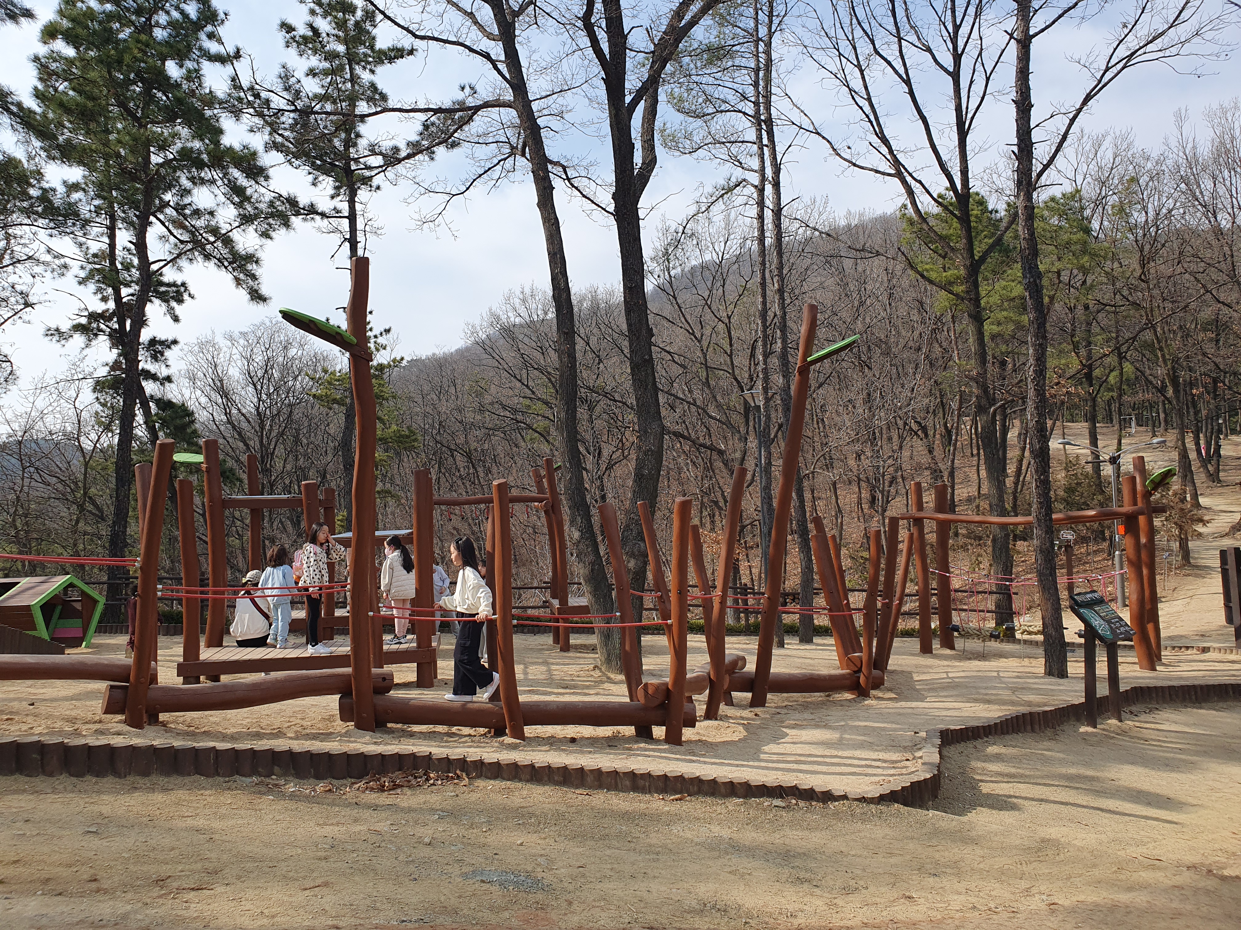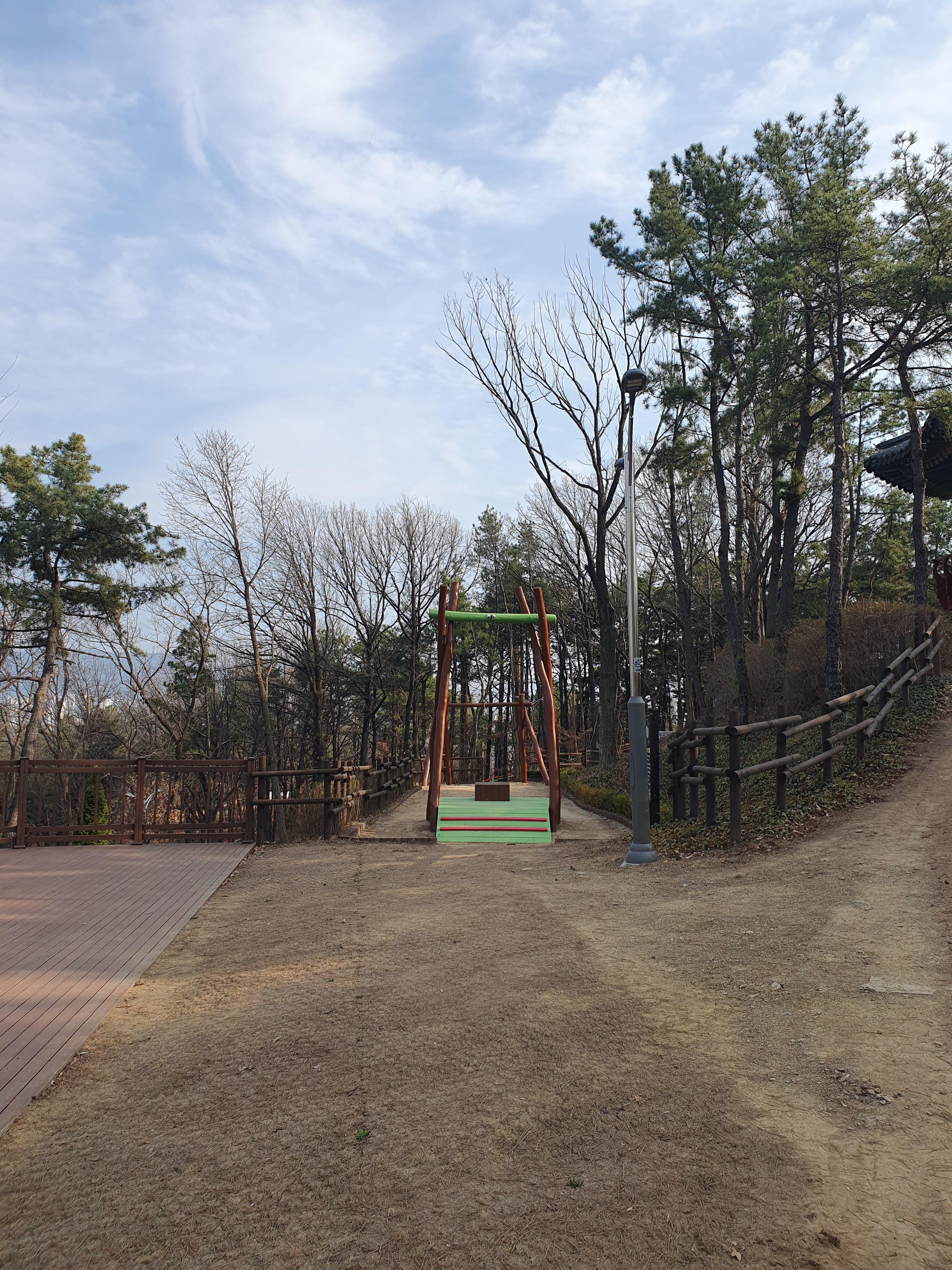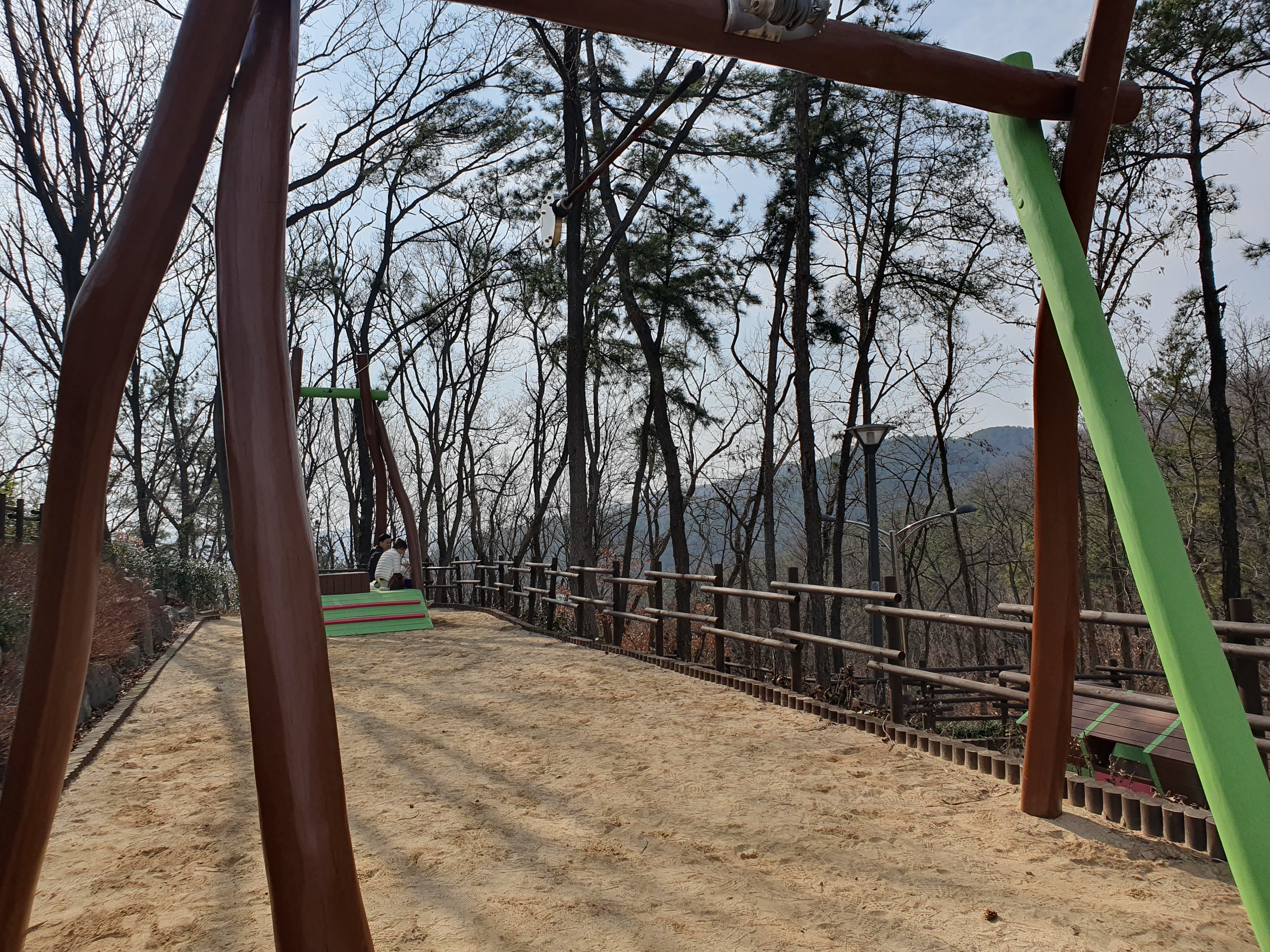 등산로를 올라 산 중턱에 가면 놀이터가 보입니다. 놀이기구가 다 나무로 되어있고 지금도 놀이시설 설치 공사가 진행 중이었습니다.