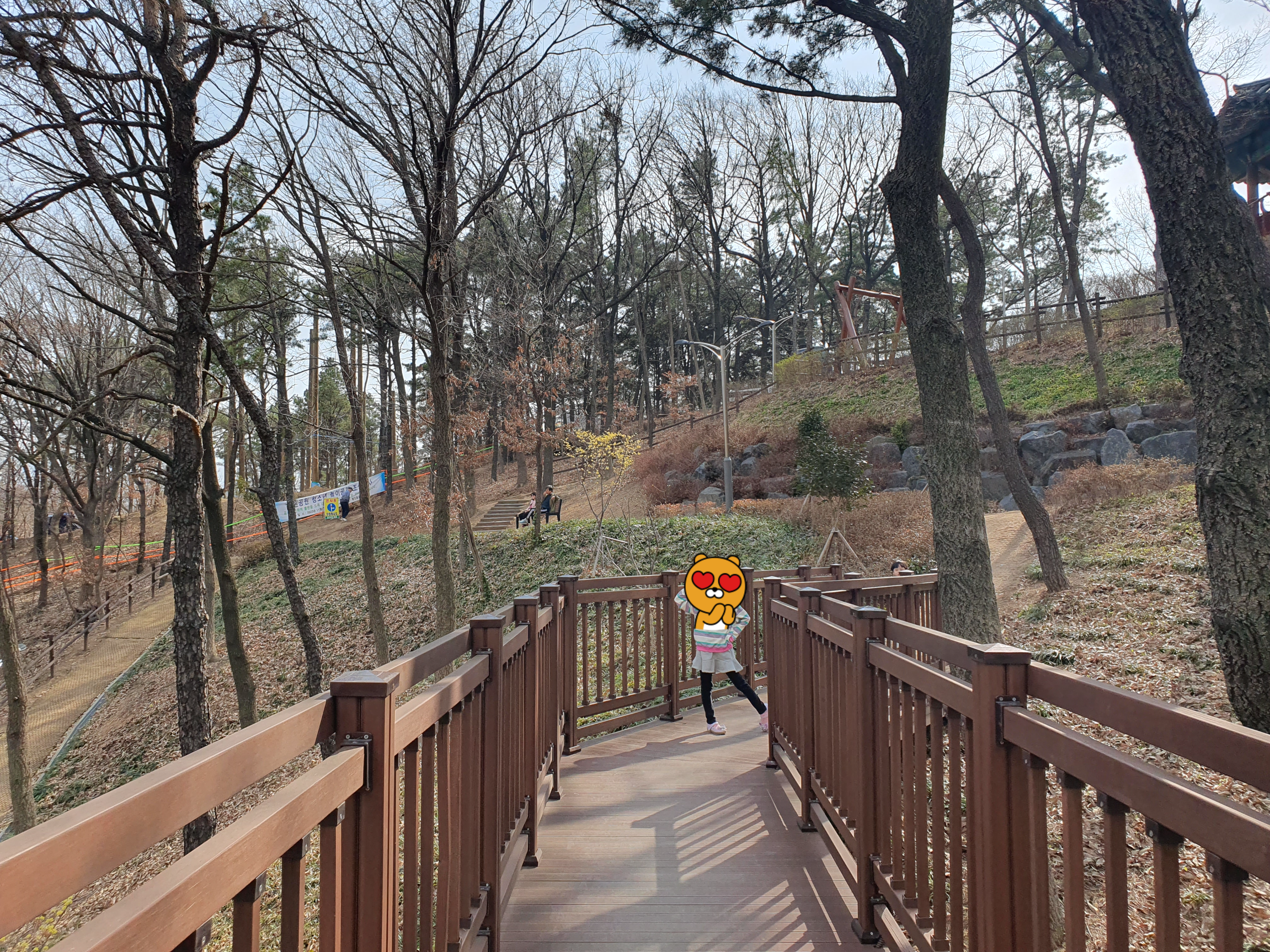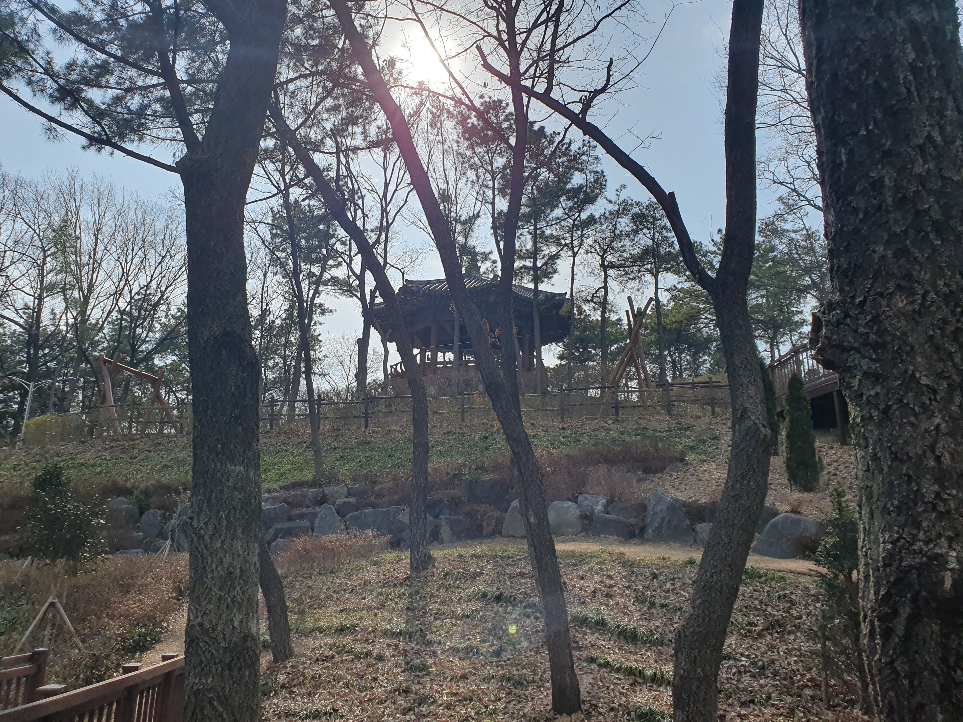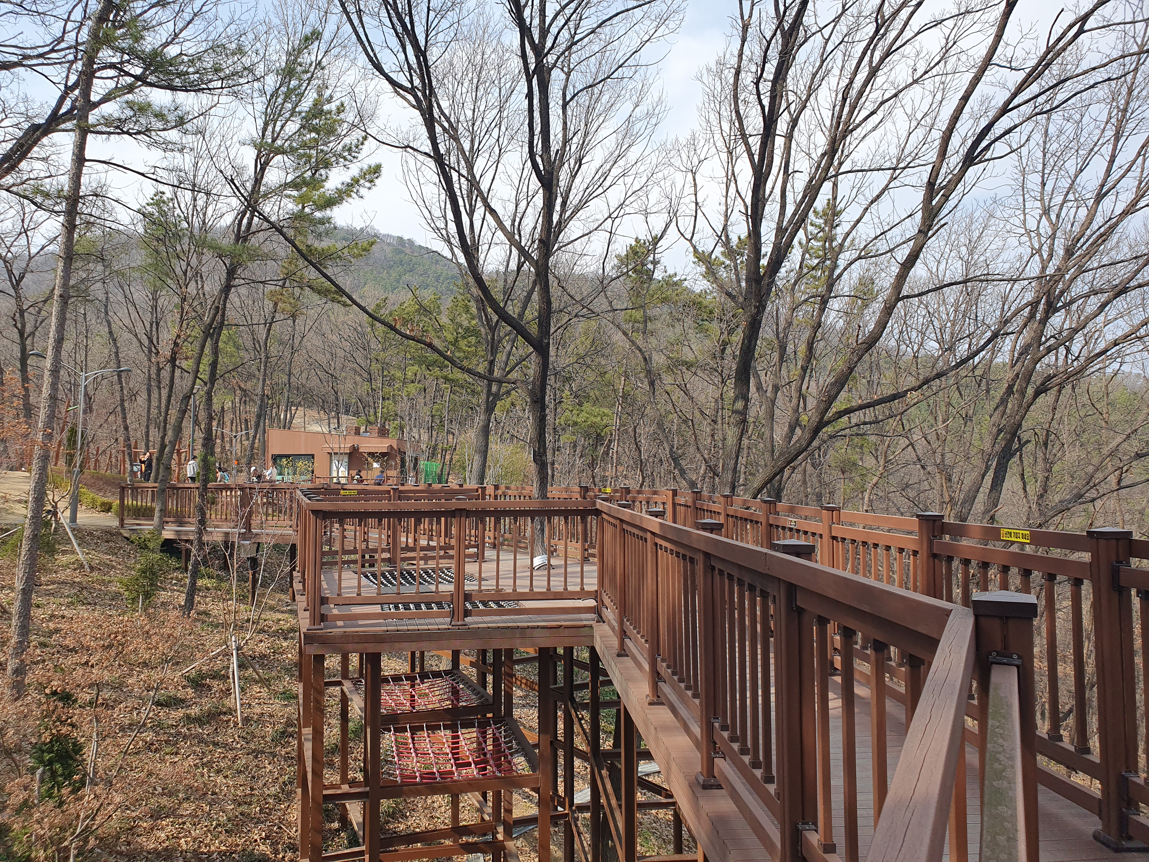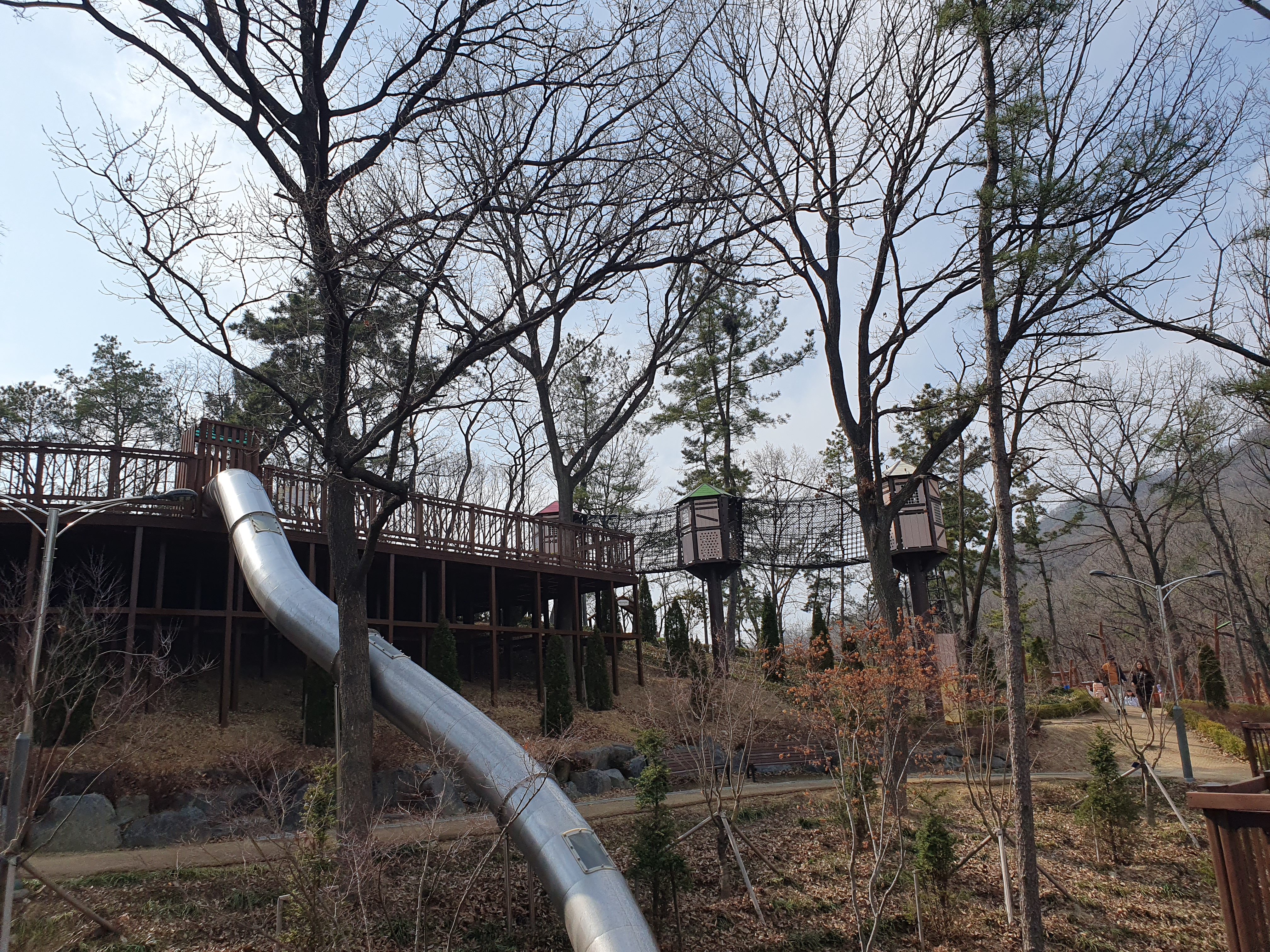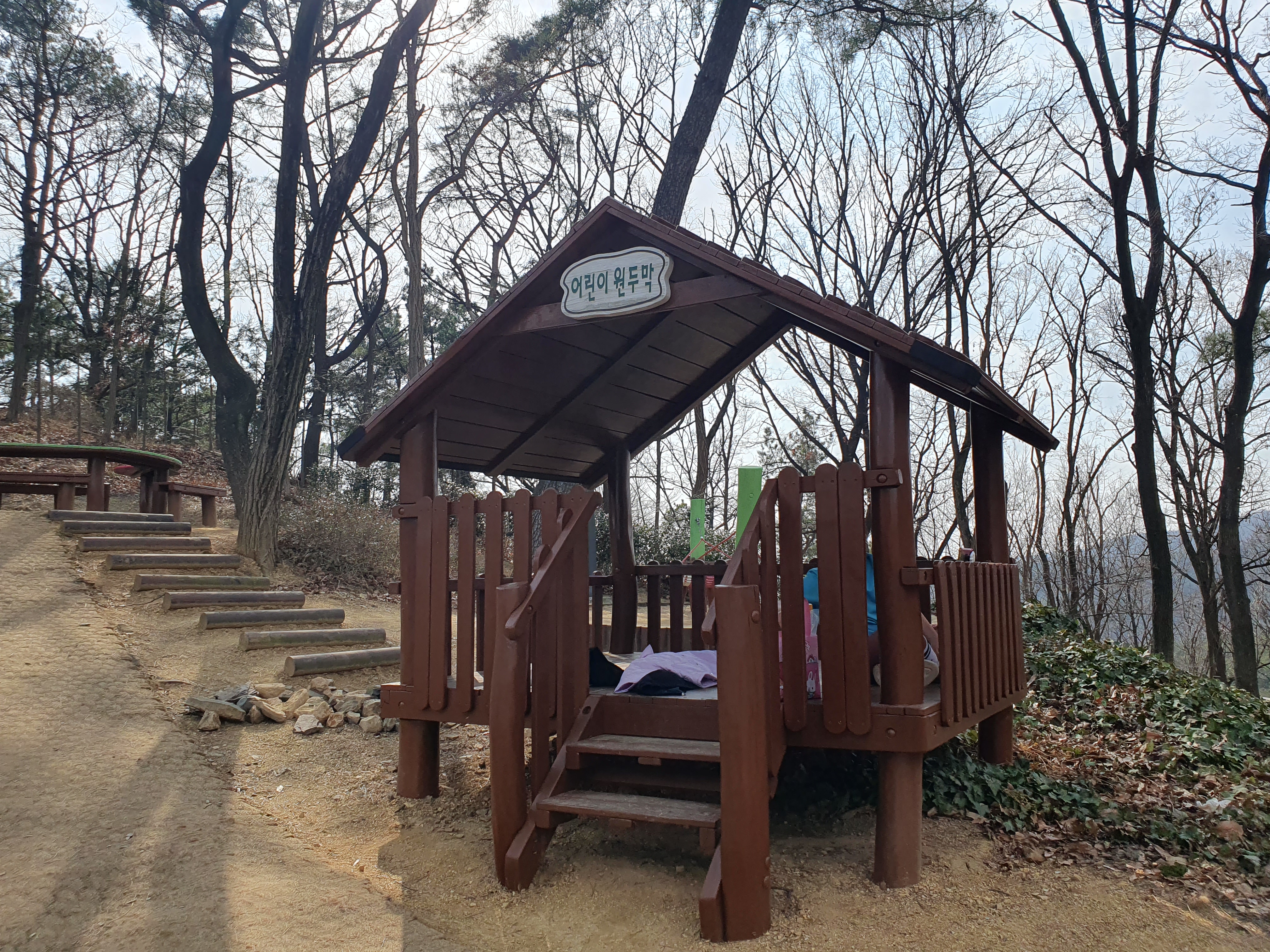 등산로를 올라 산 중턱에 가면 놀이터가 보입니다. 놀이기구가 다 나무로 되어있고 지금도 놀이시설 설치 공사가 진행 중이었습니다.