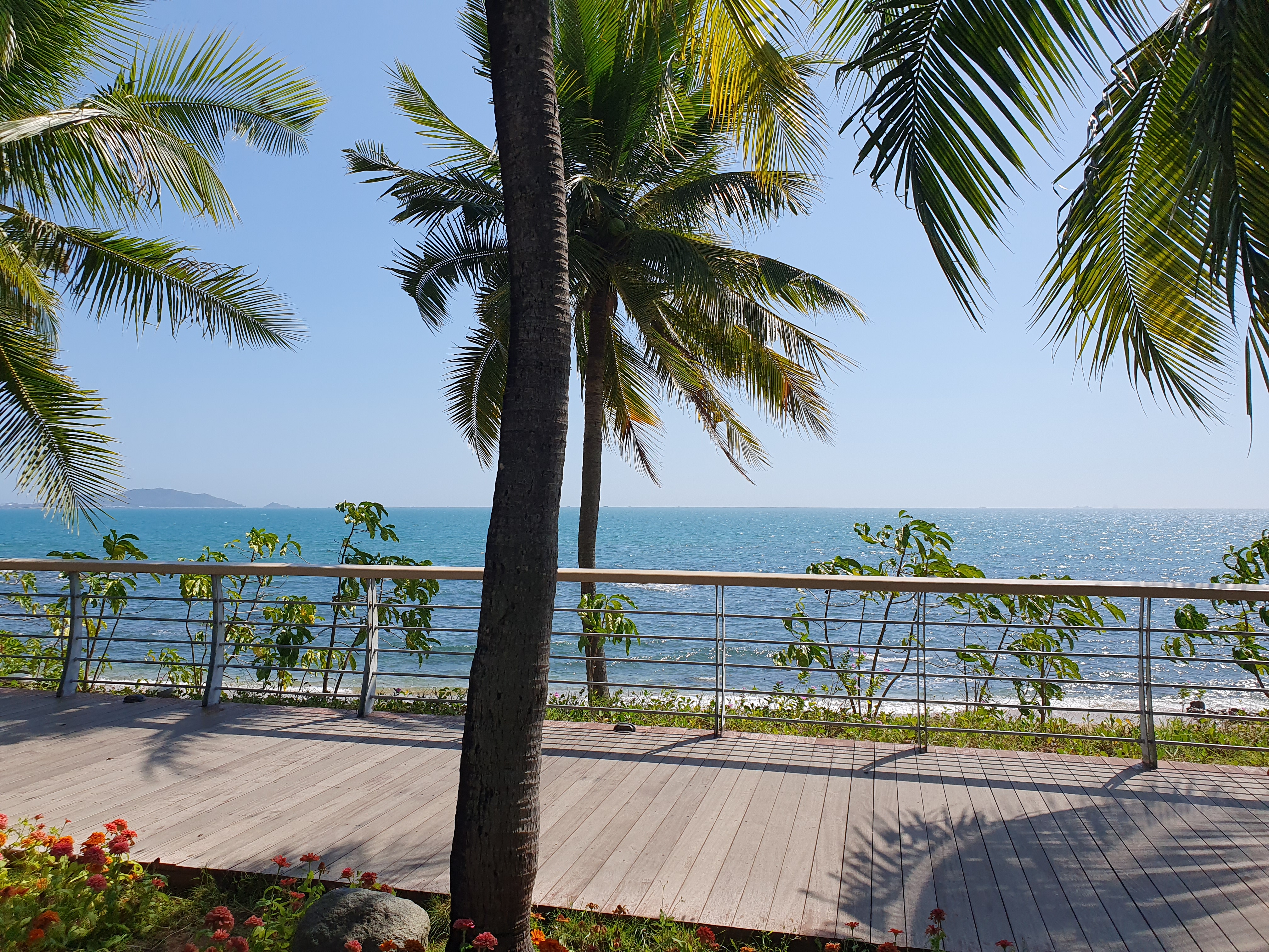야자수 나무 너머로 보이는 해변이 너무 아름다웠습니다.
