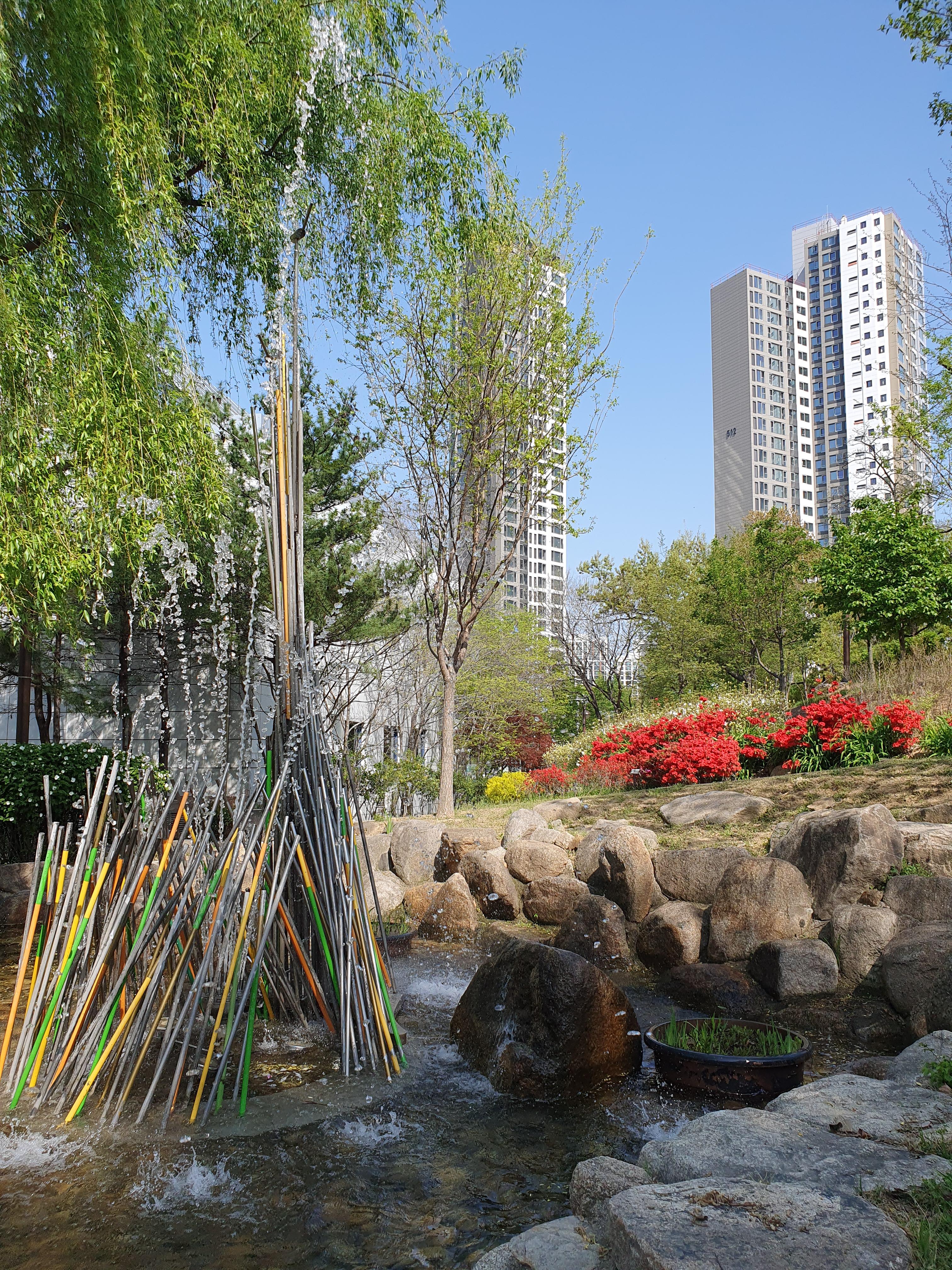 분수대 옆에 자그마한 인공 계곡이 있어 아이들이 물놀이 하며 놀 수 있습니다.