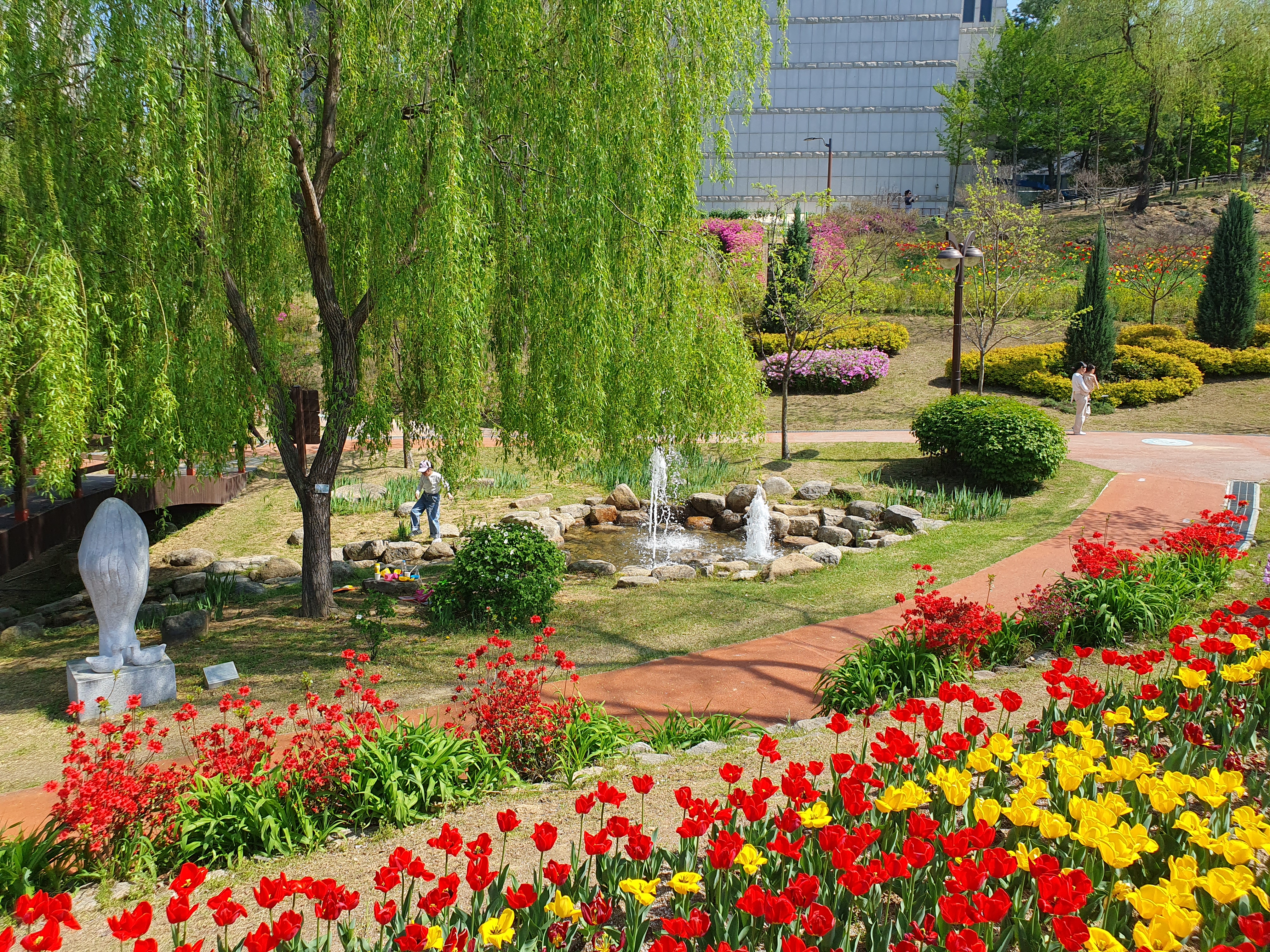 어린이 놀이터를 지나 공원에 들어서자 마자 예쁜 분수와 아름다운 튤립이 저희 시선을 사로 잡았습니다.