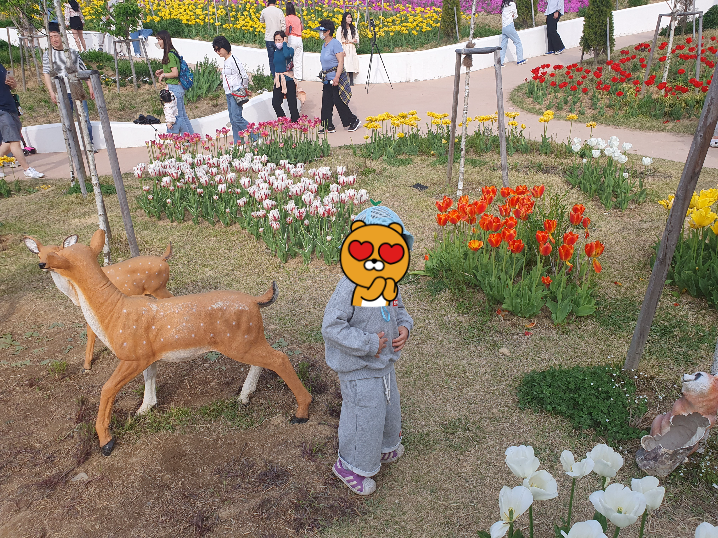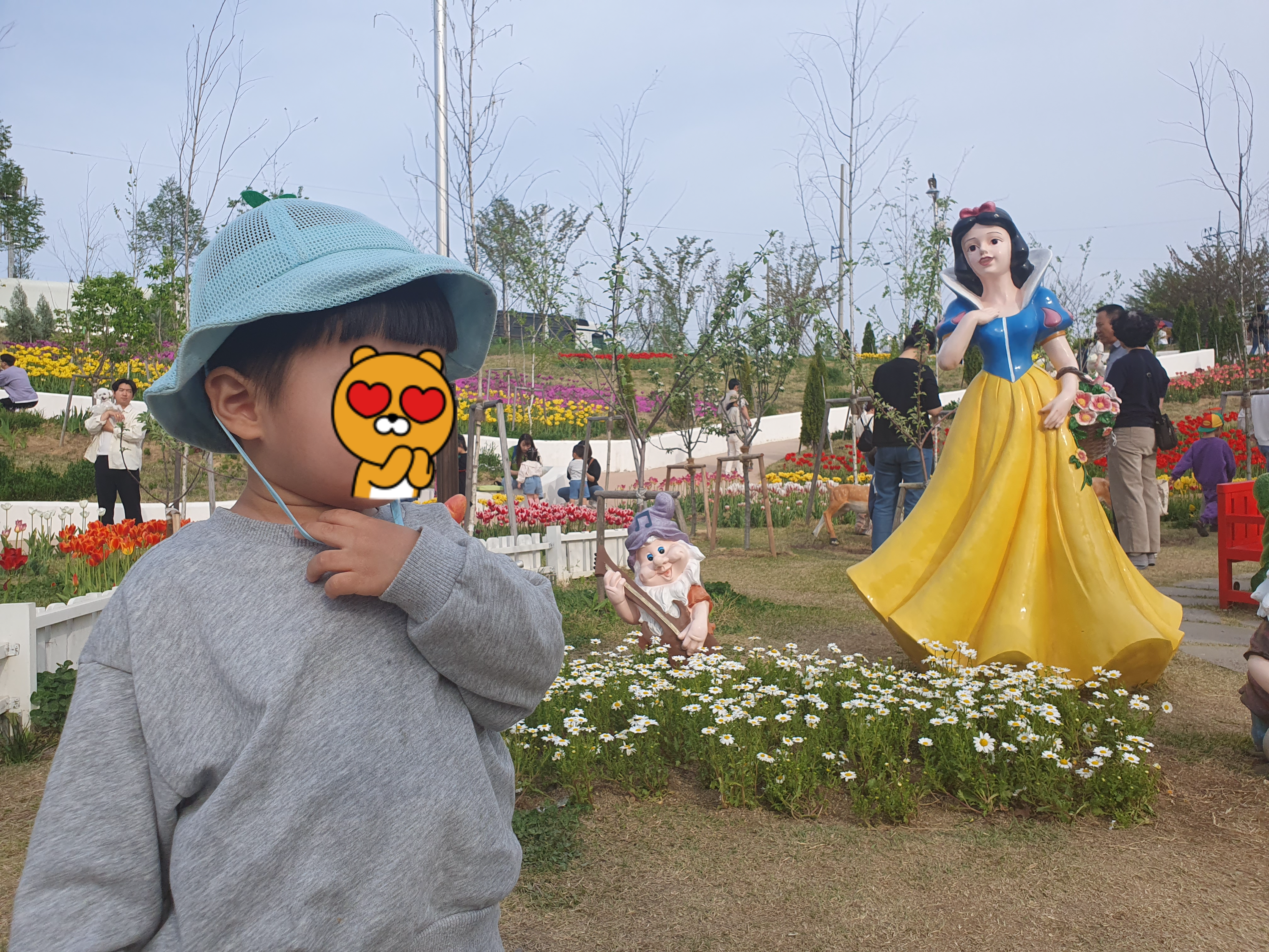 아이들이 좋아할 만한 인형 모형들과 아름다운 꽃들이 많았습니다.
