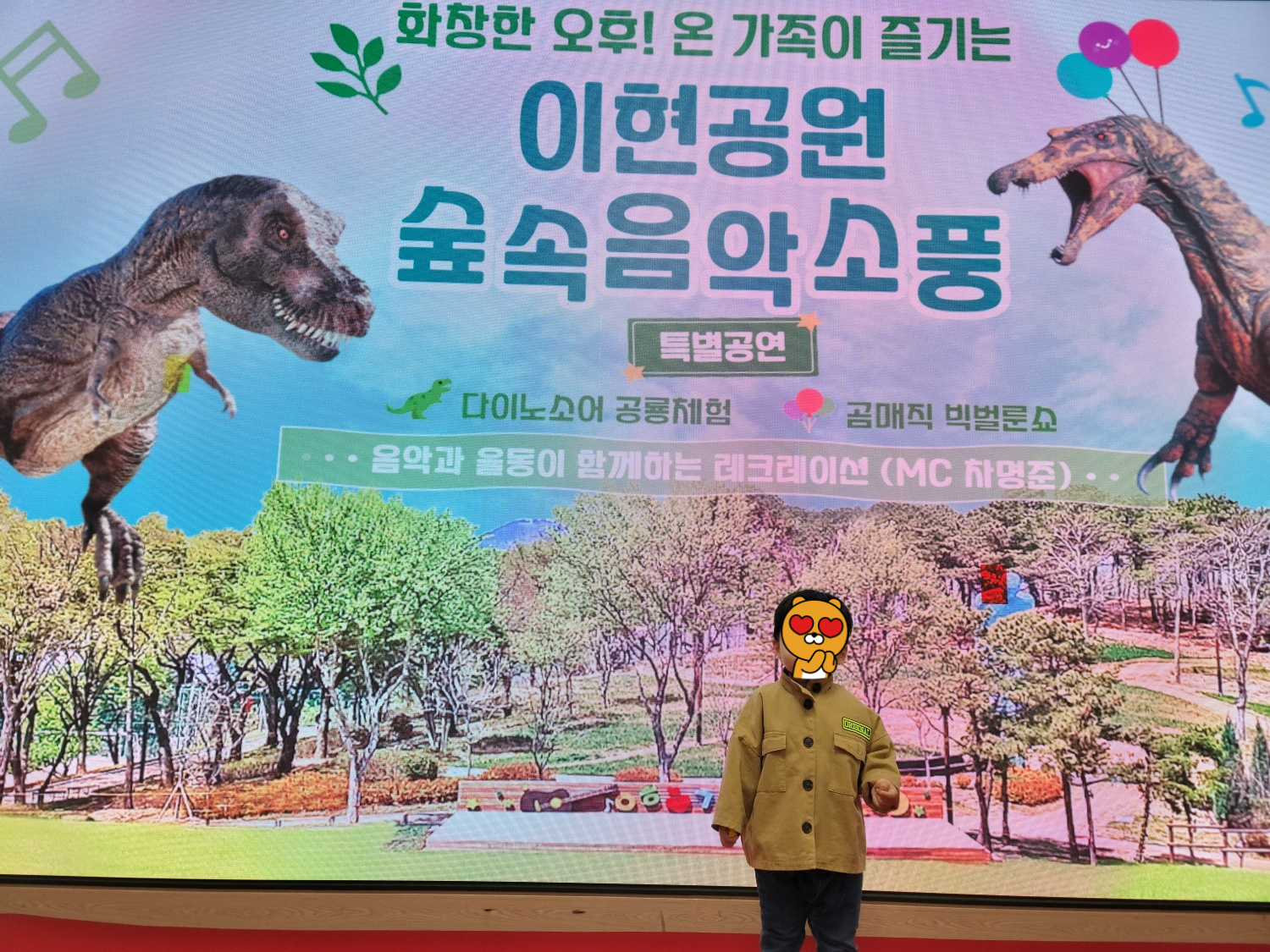 지난주에 이어 이번주에도 이현공원에 다녀왔습니다. 오늘은 아이들이 좋아할 만한 행사를 한다고 해서 왔었는데 비가와서 실내에서 행사를 했습니다. 남자아이들이 좋아하는 공룡들이 나와 마술쇼도 하고 같이 노래도 부르는 시간을 보냈습니다.