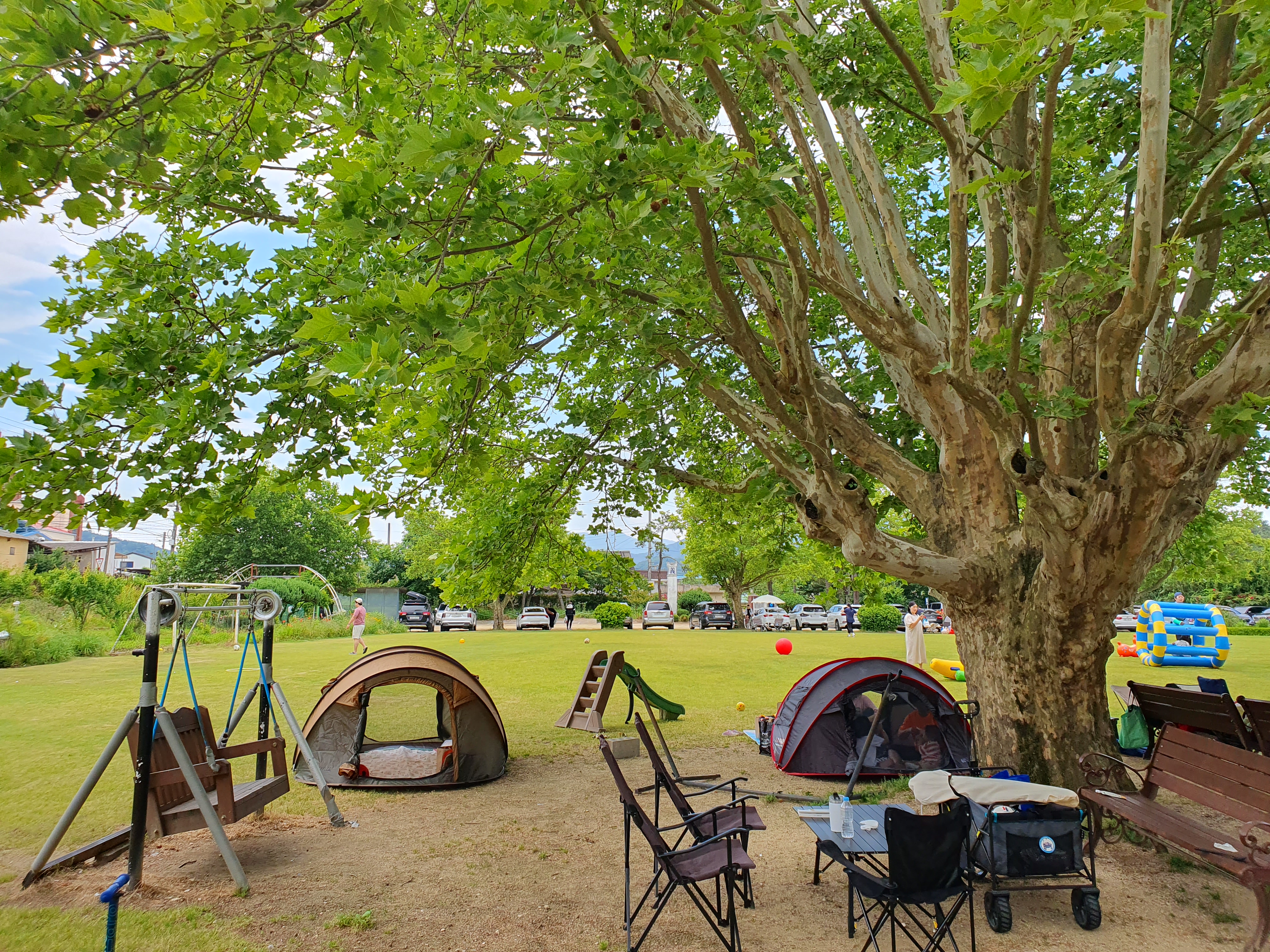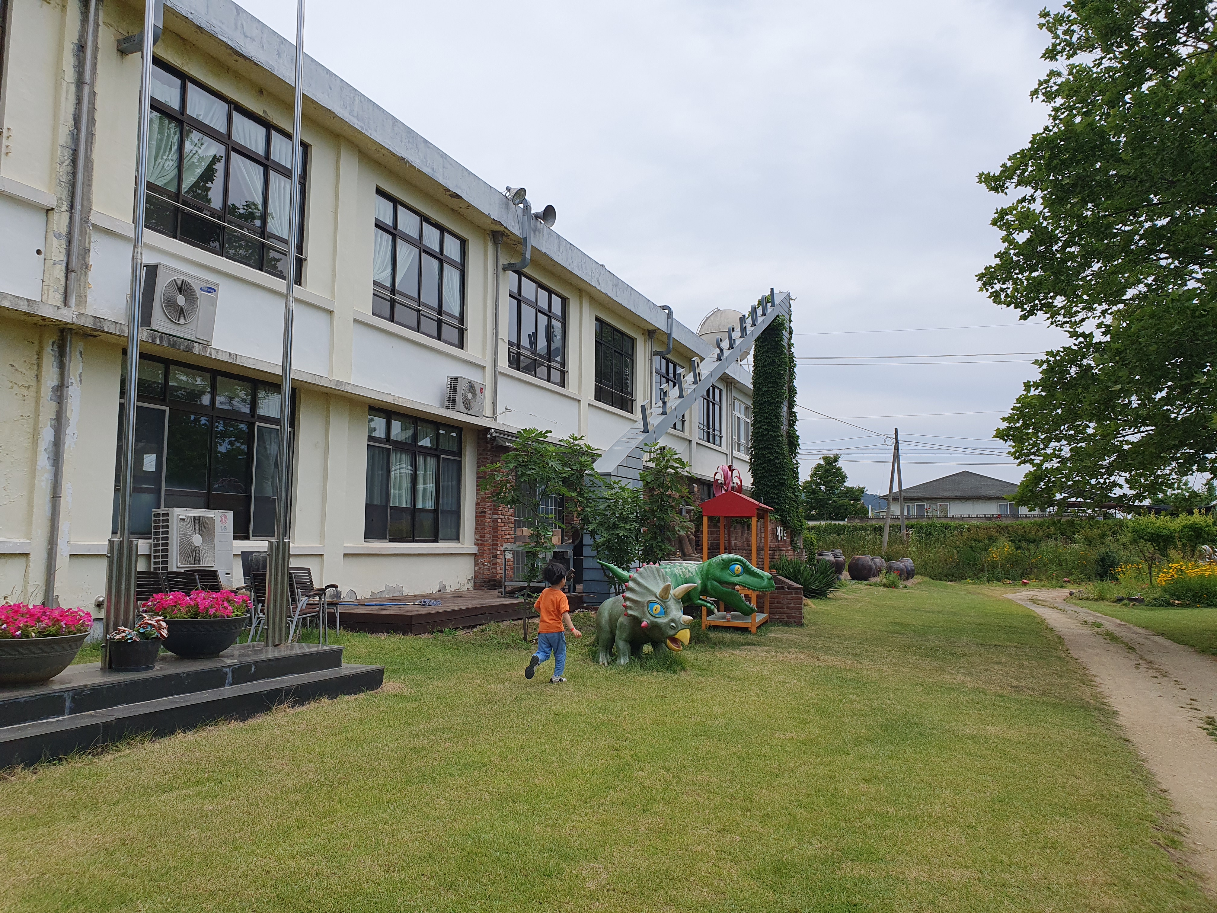 폐교를 캠핑장으로 만든 곳인데 넓은 운동장에 잔디가 깔려 있어 아이들이 신나게 뛰어놀수 있는 곳이었습니다.