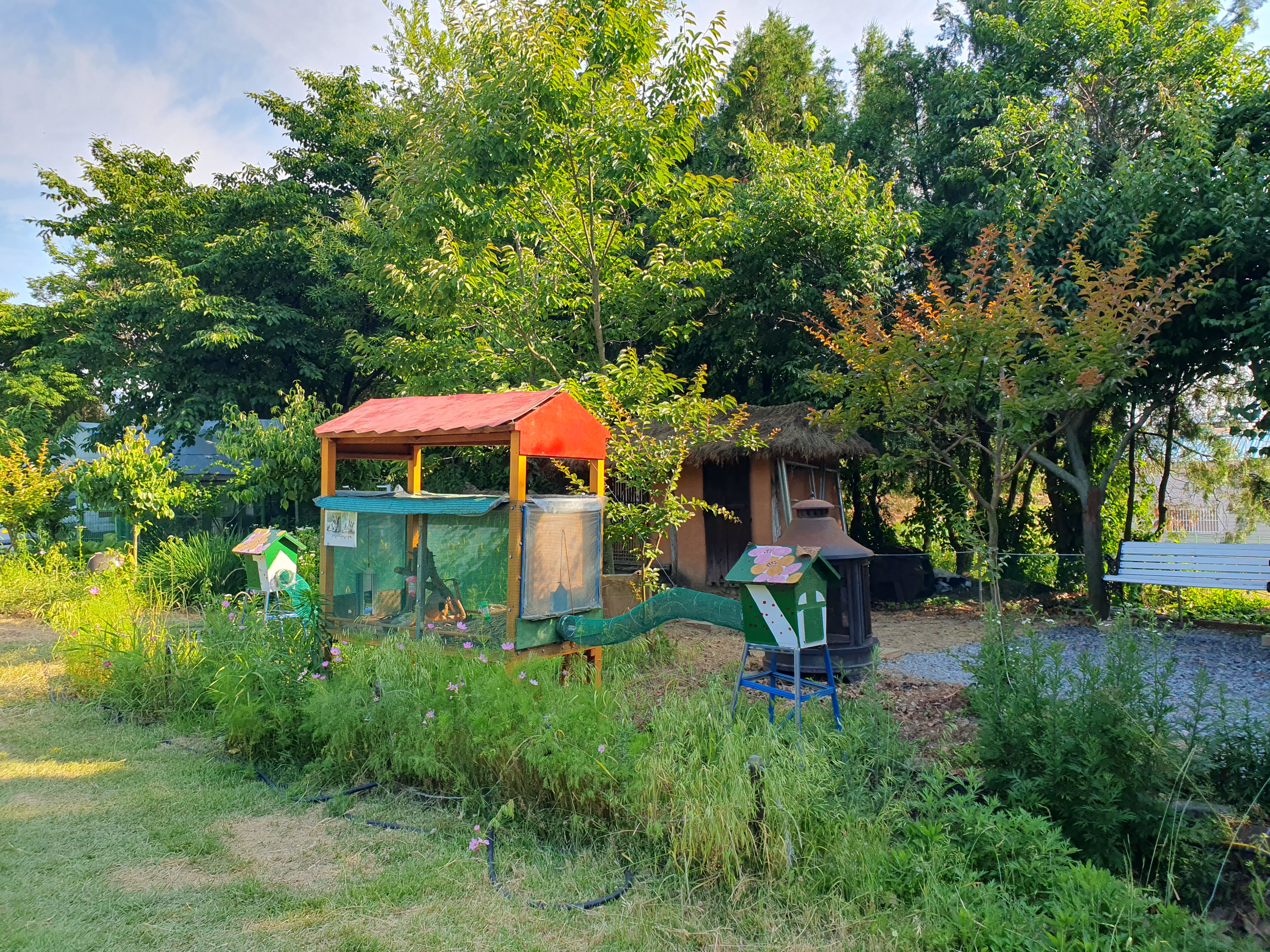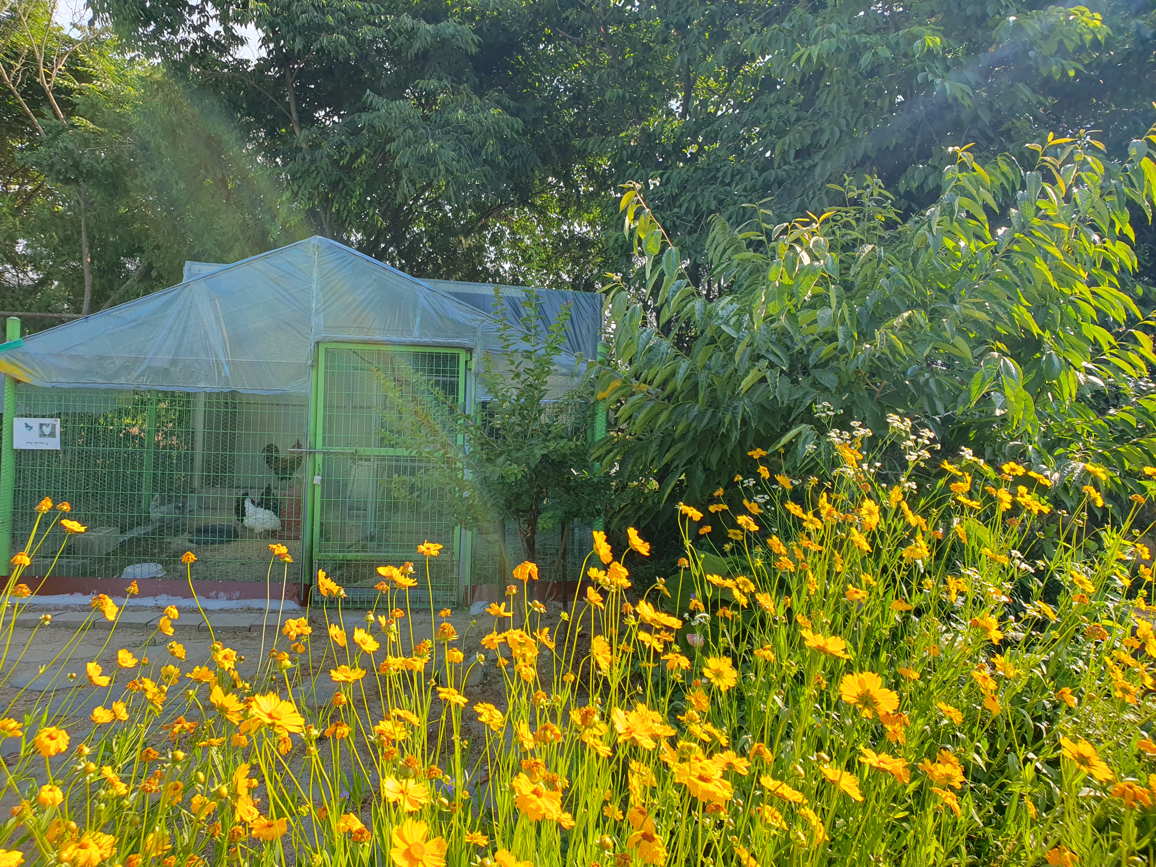 학교 정문 옆에 작은 정원같은 공간이 있는데 닭이랑 다람쥐 같은 동물도 볼 수 있습니다.