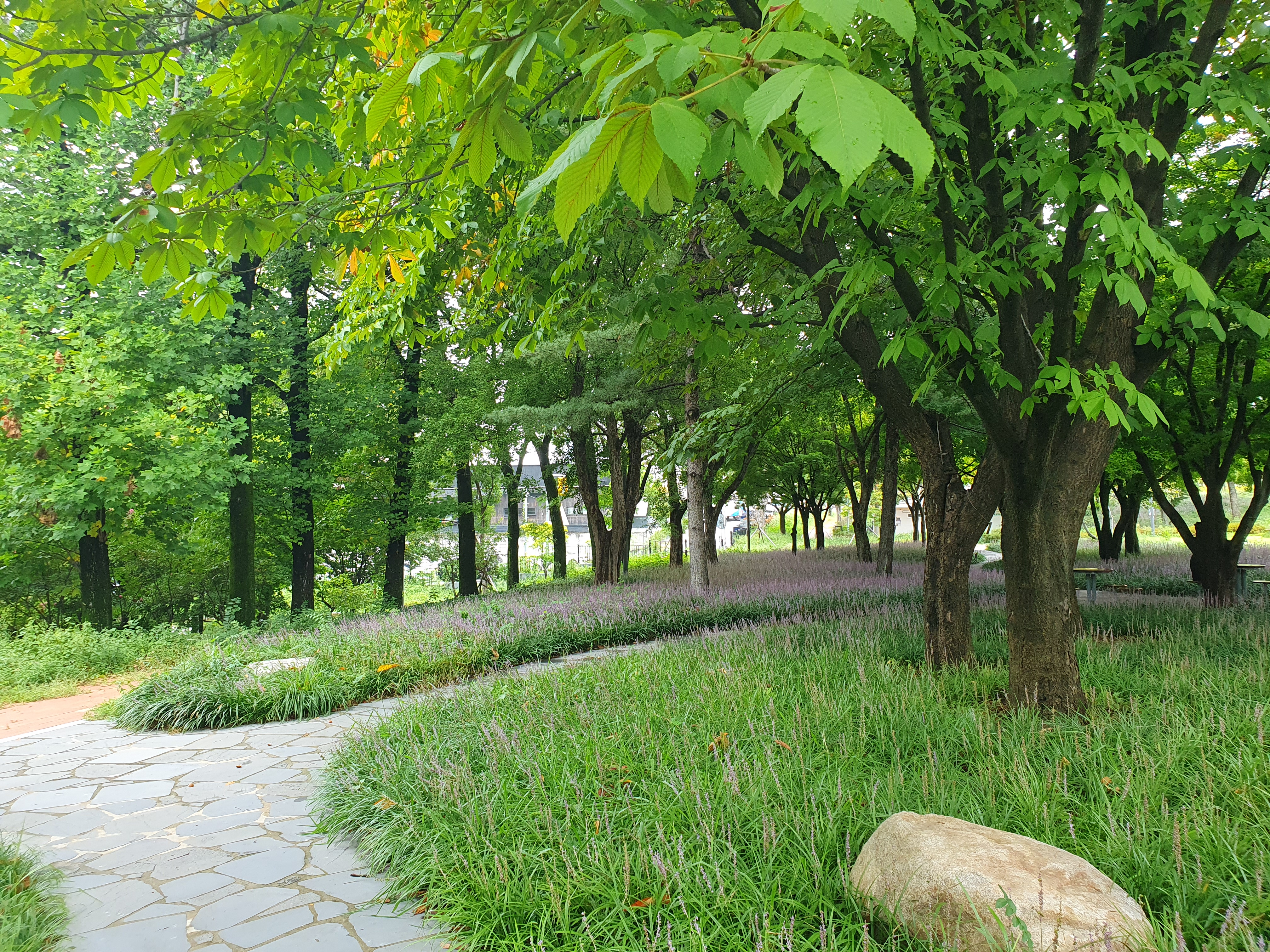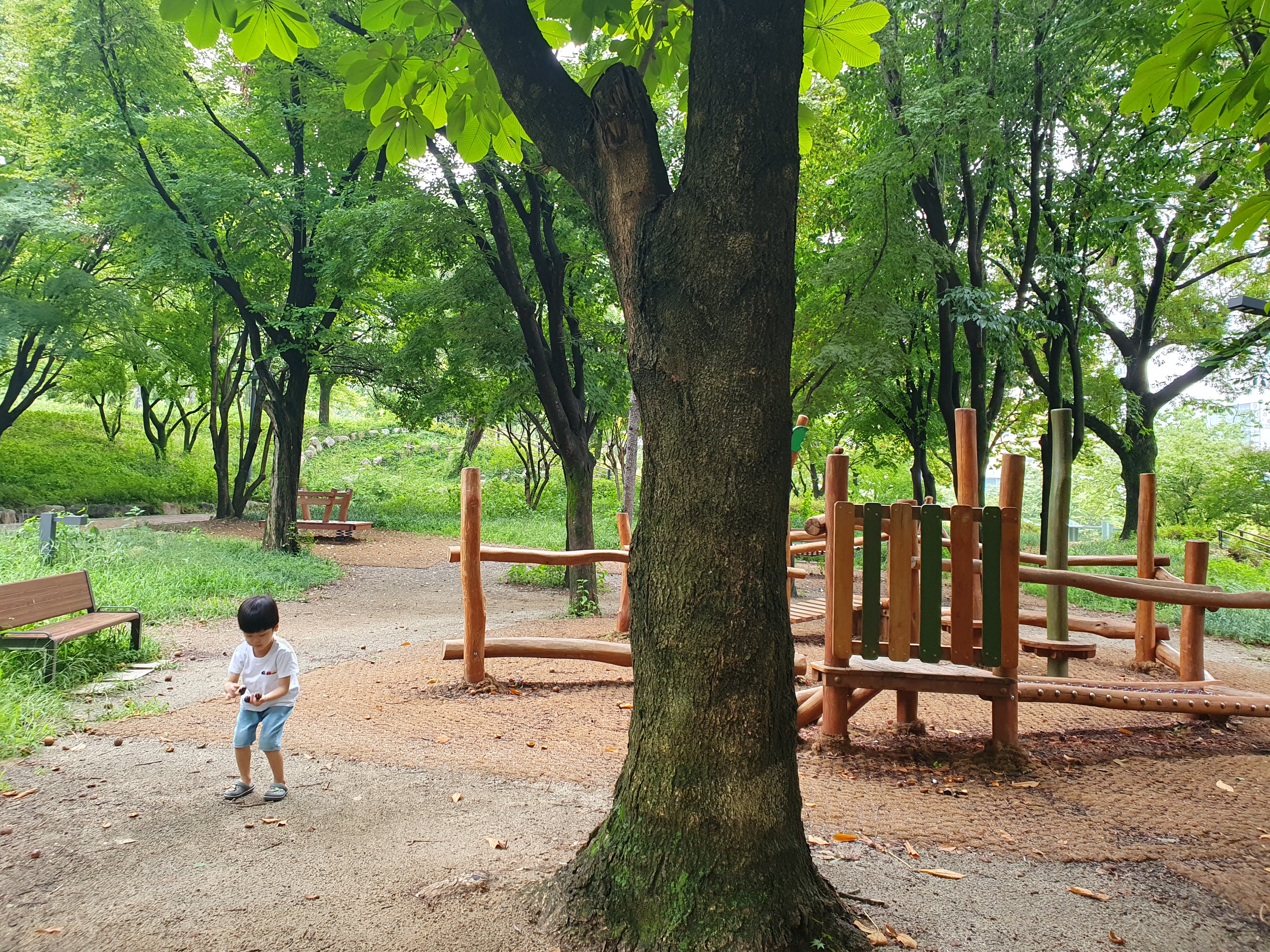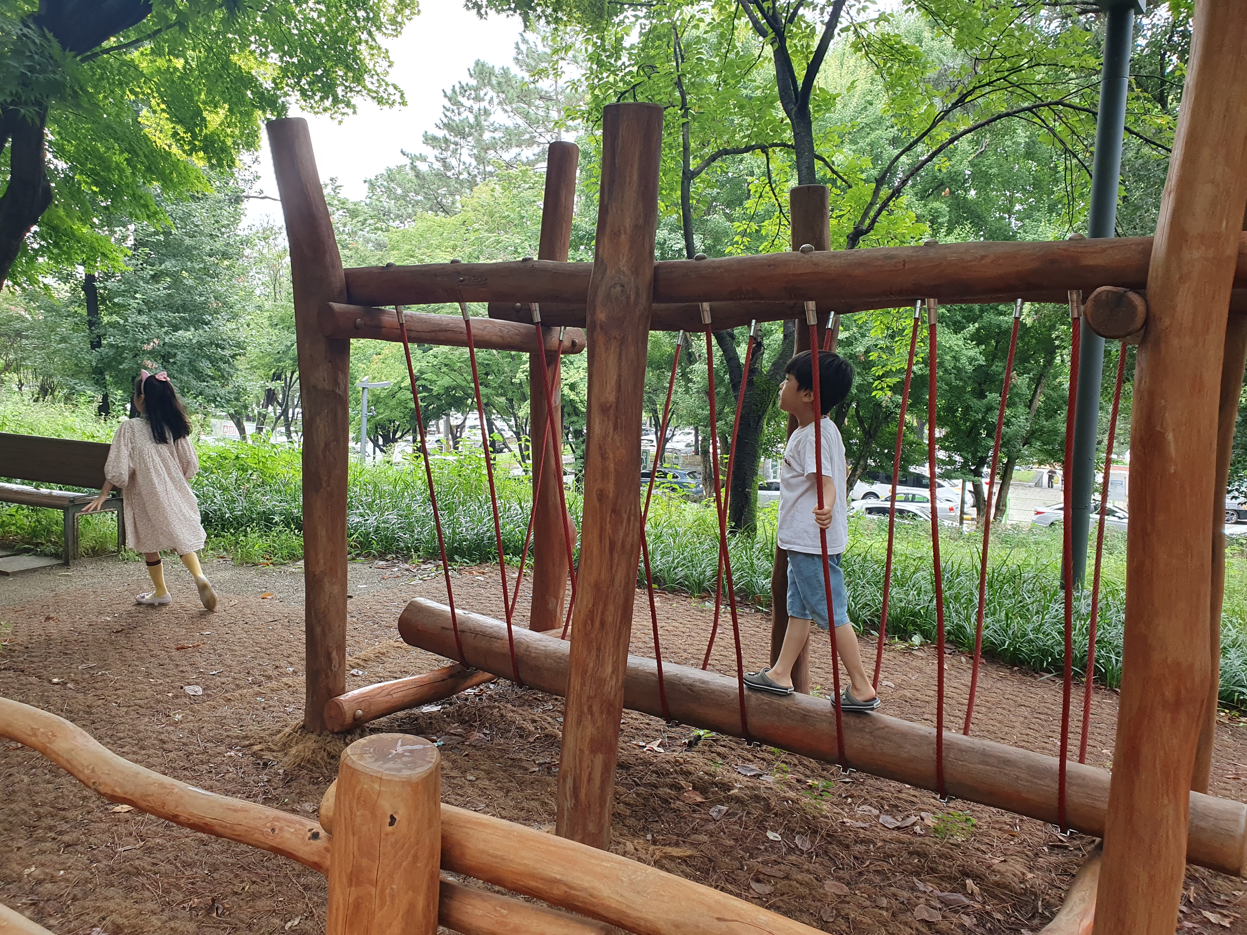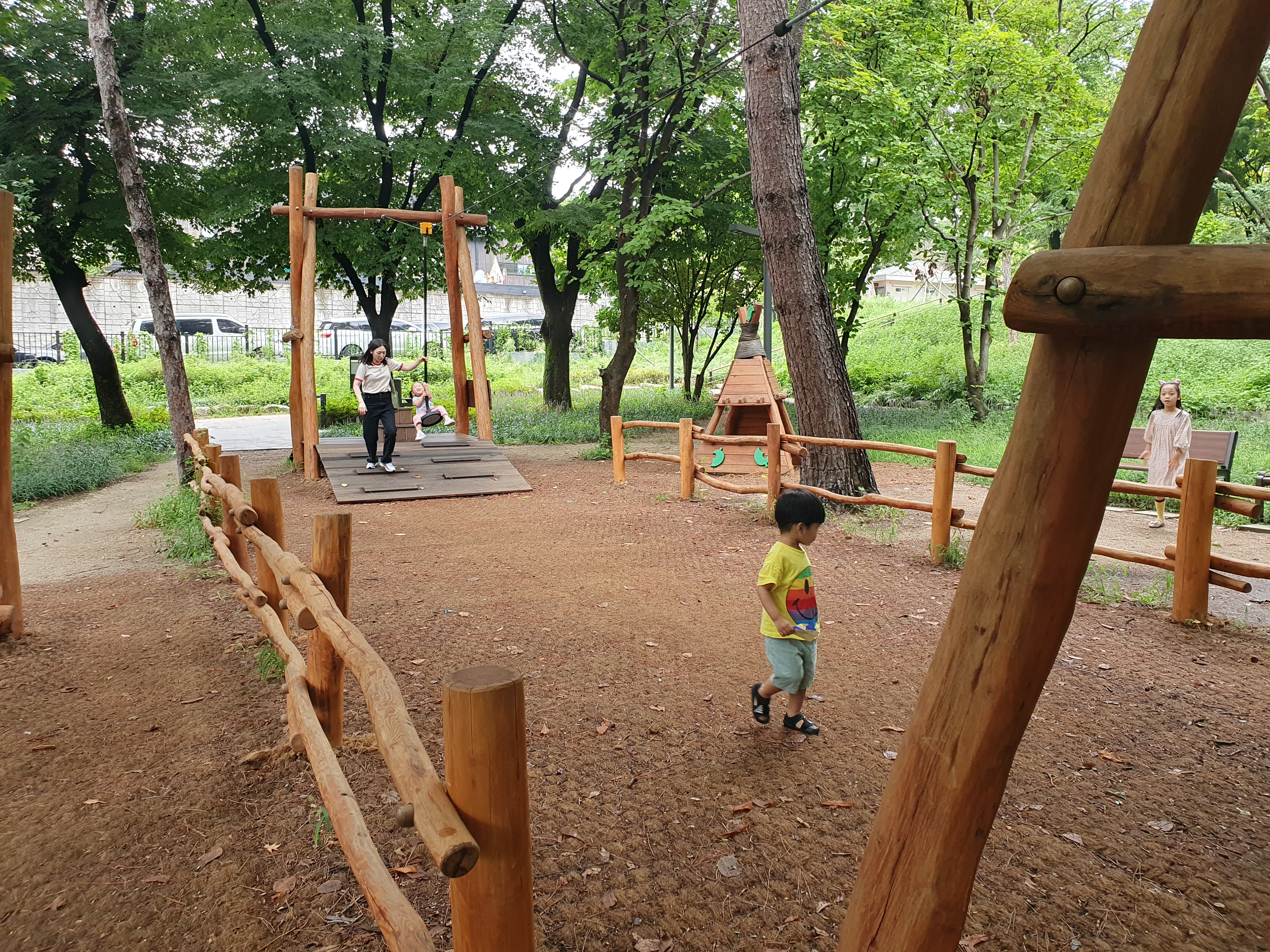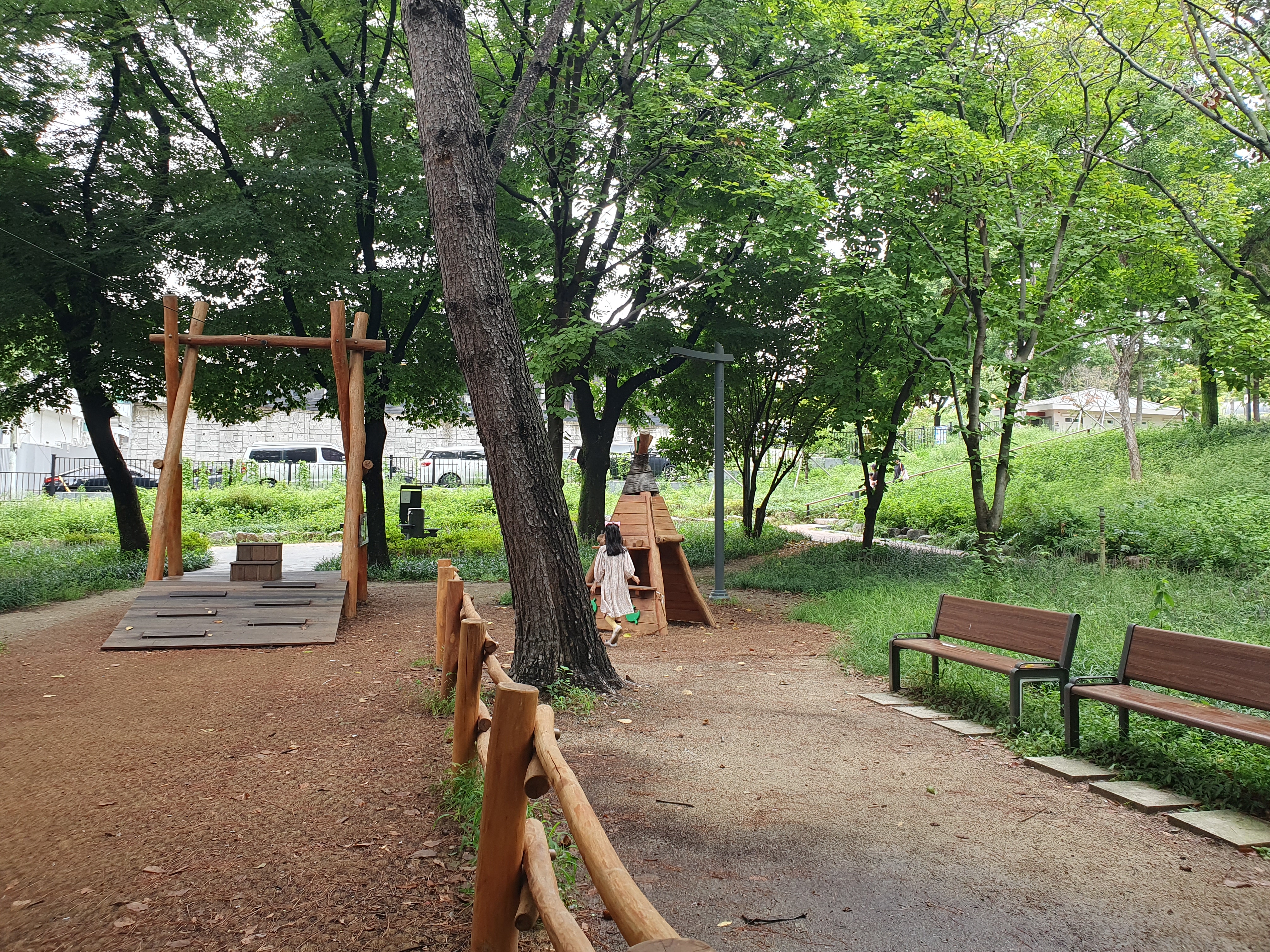 어린이세상 건물 가기전에 숲속에 놀이터가 있어 아이들이 놀기 좋습니다.