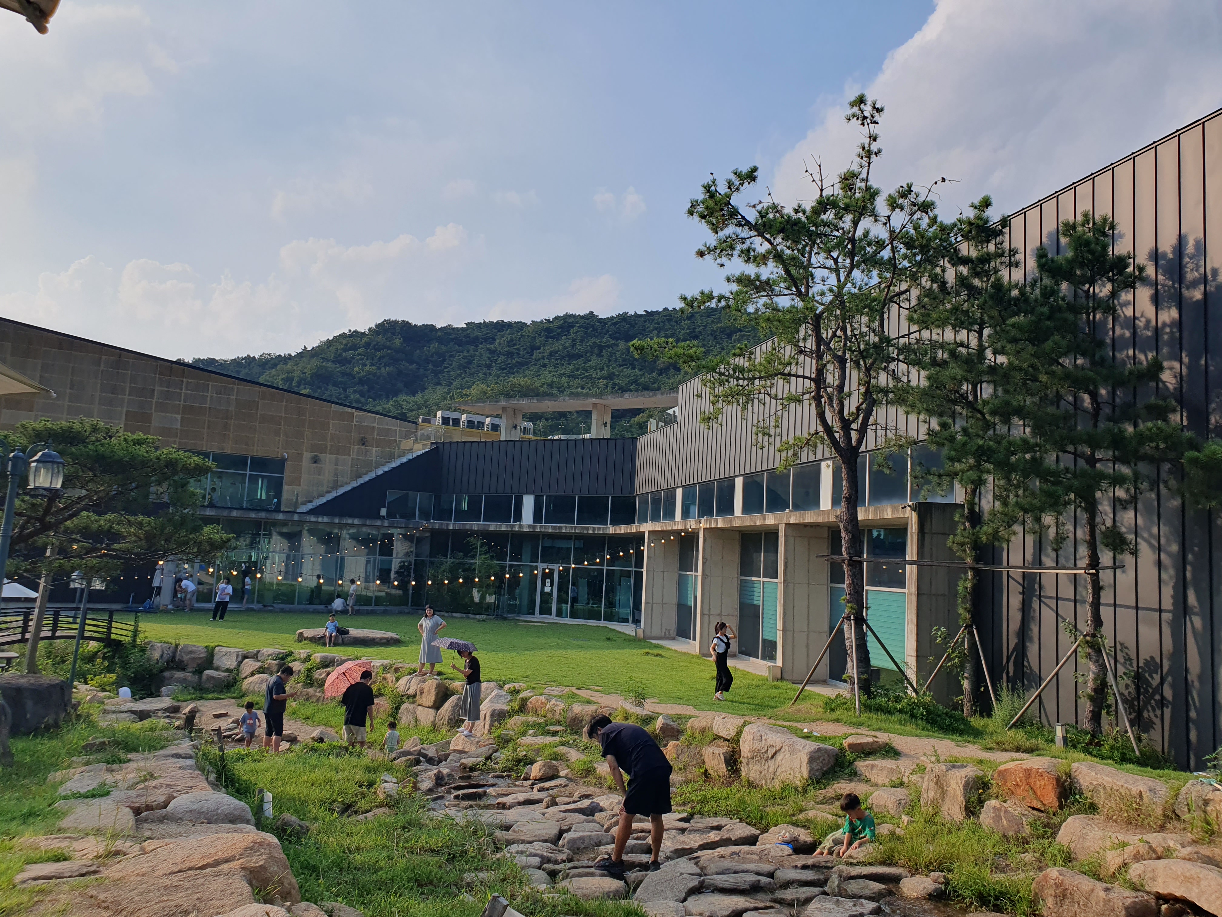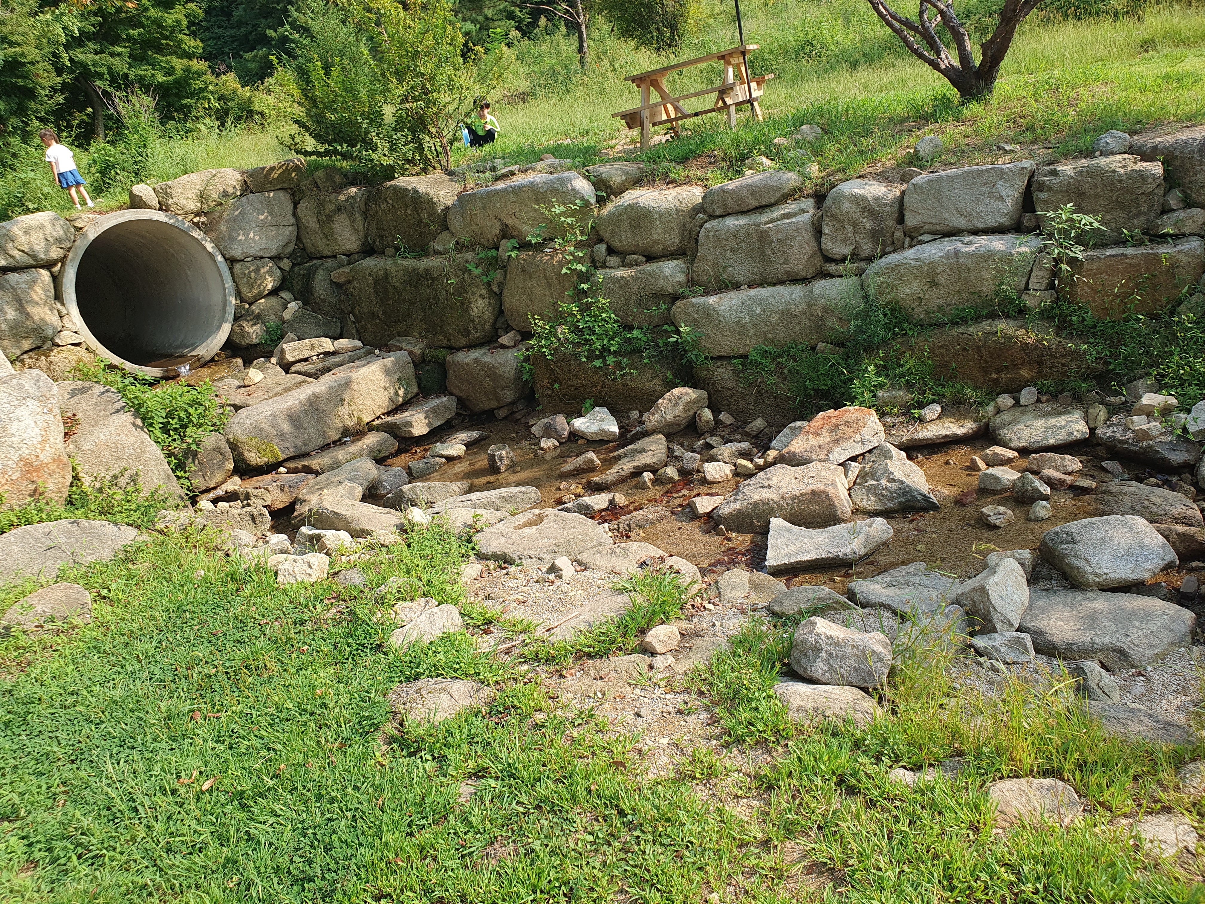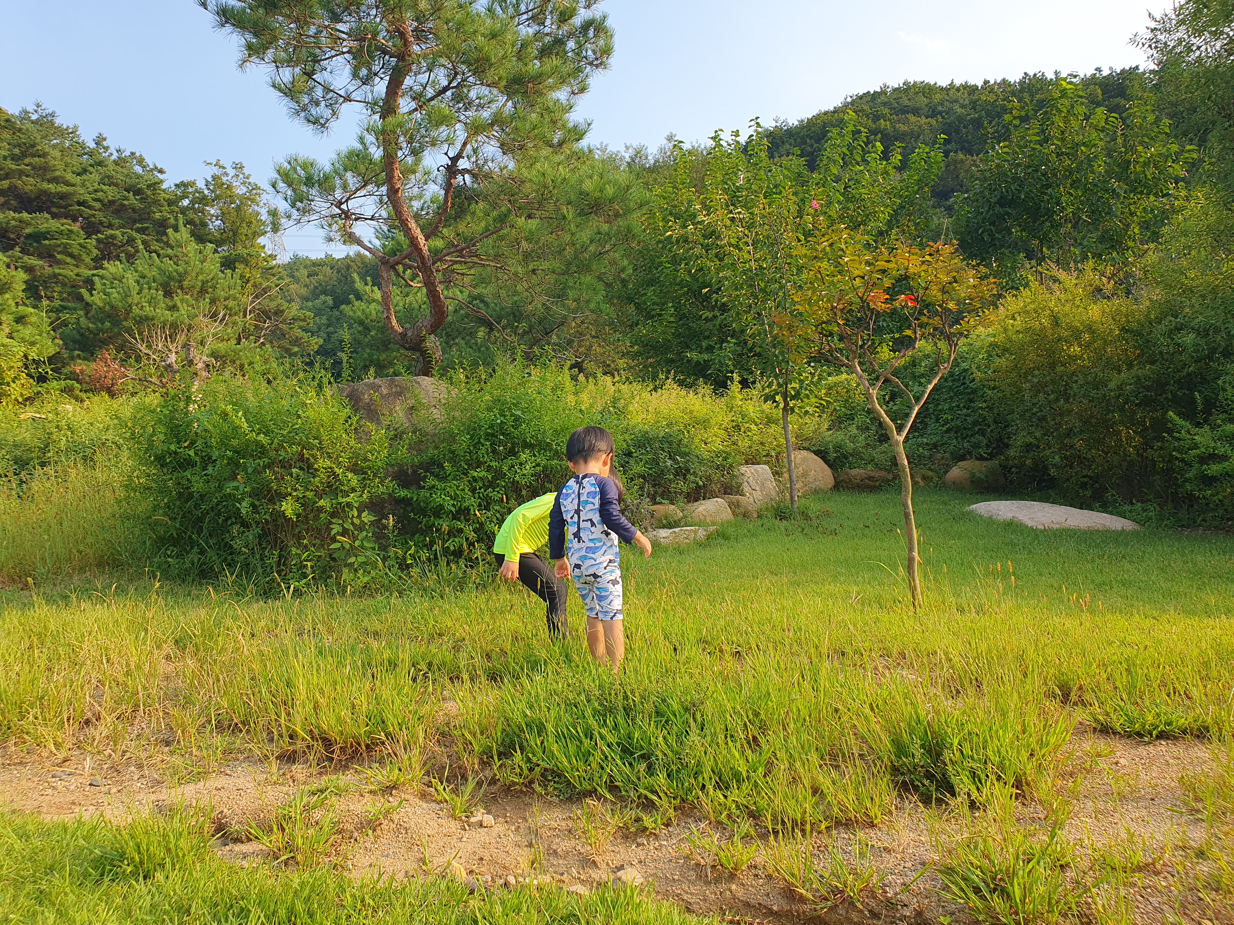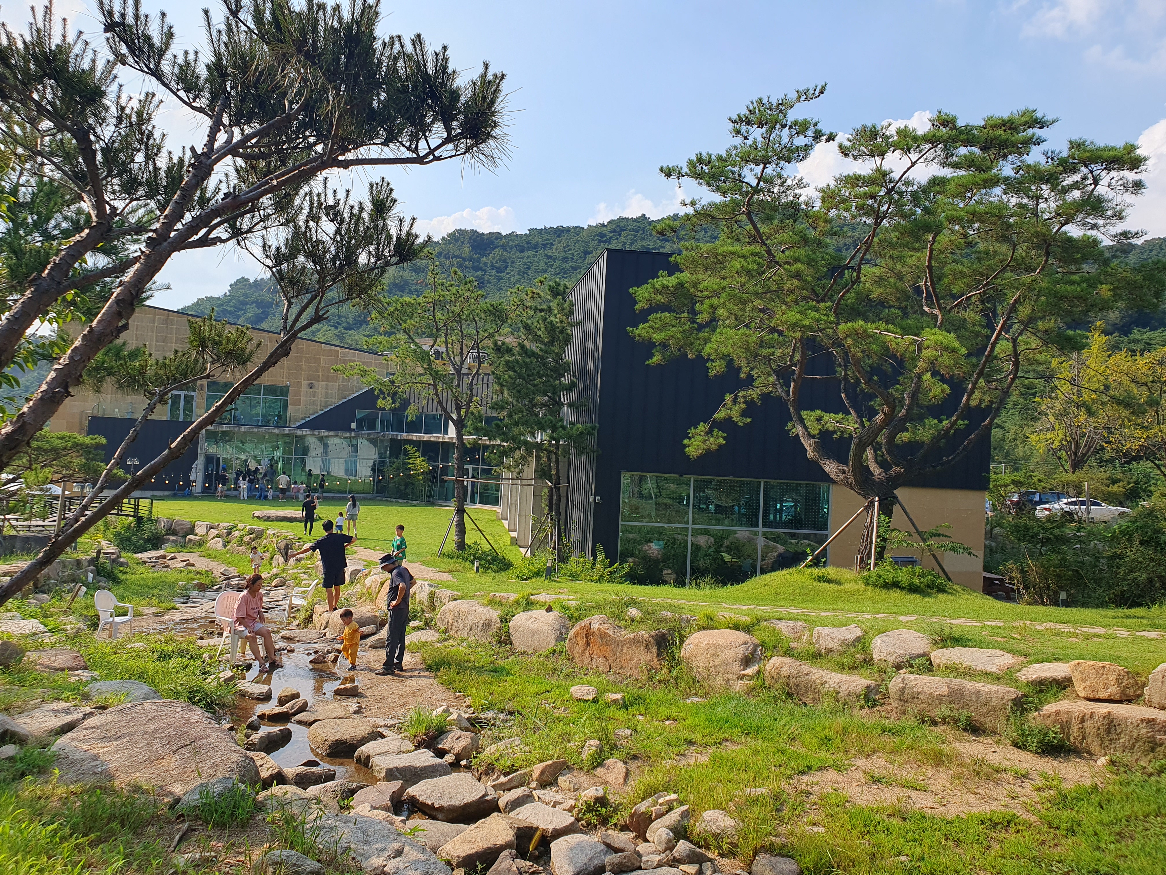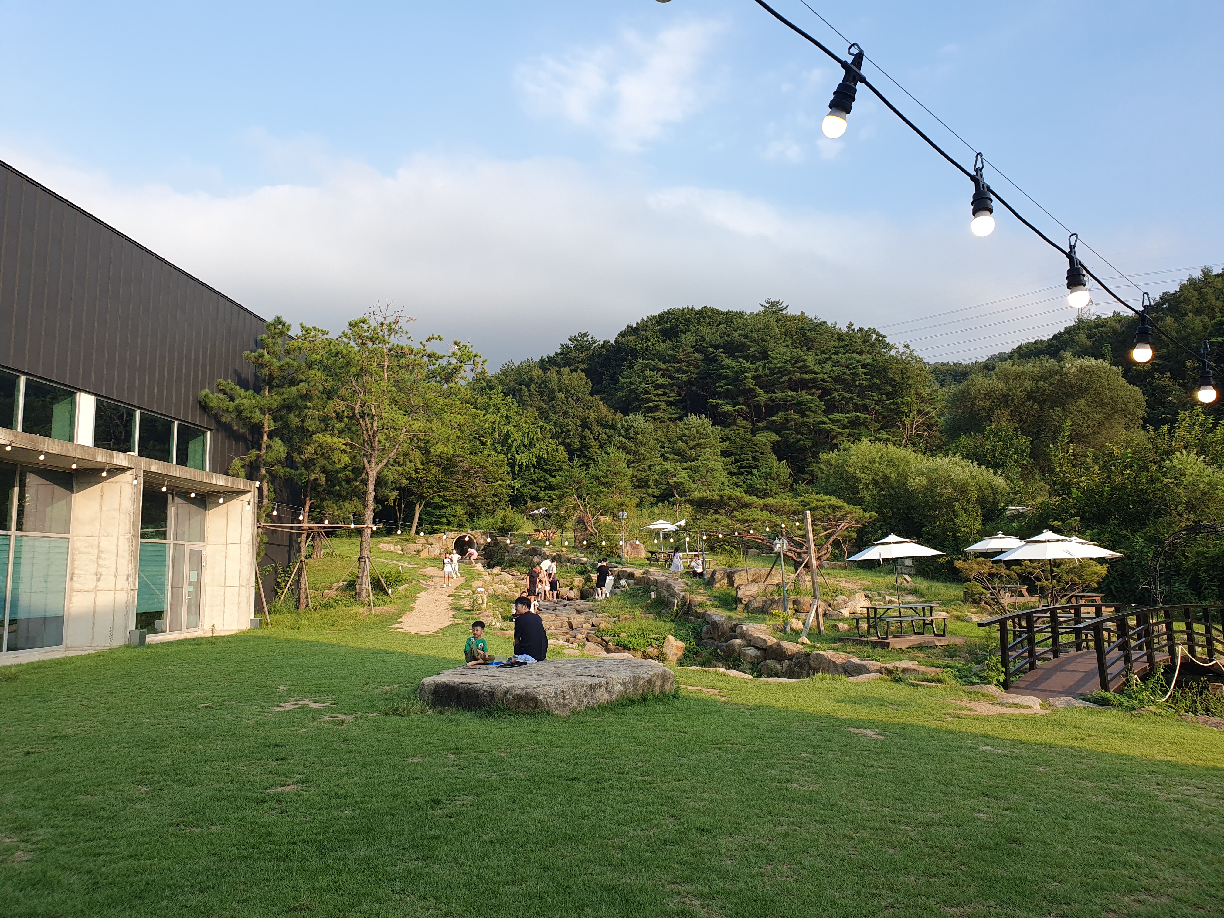 카페 앞쪽에 넓은 잔디밭과 계곡이 있어 아이들이 마음껏 뛰어 놀 수 있습니다.