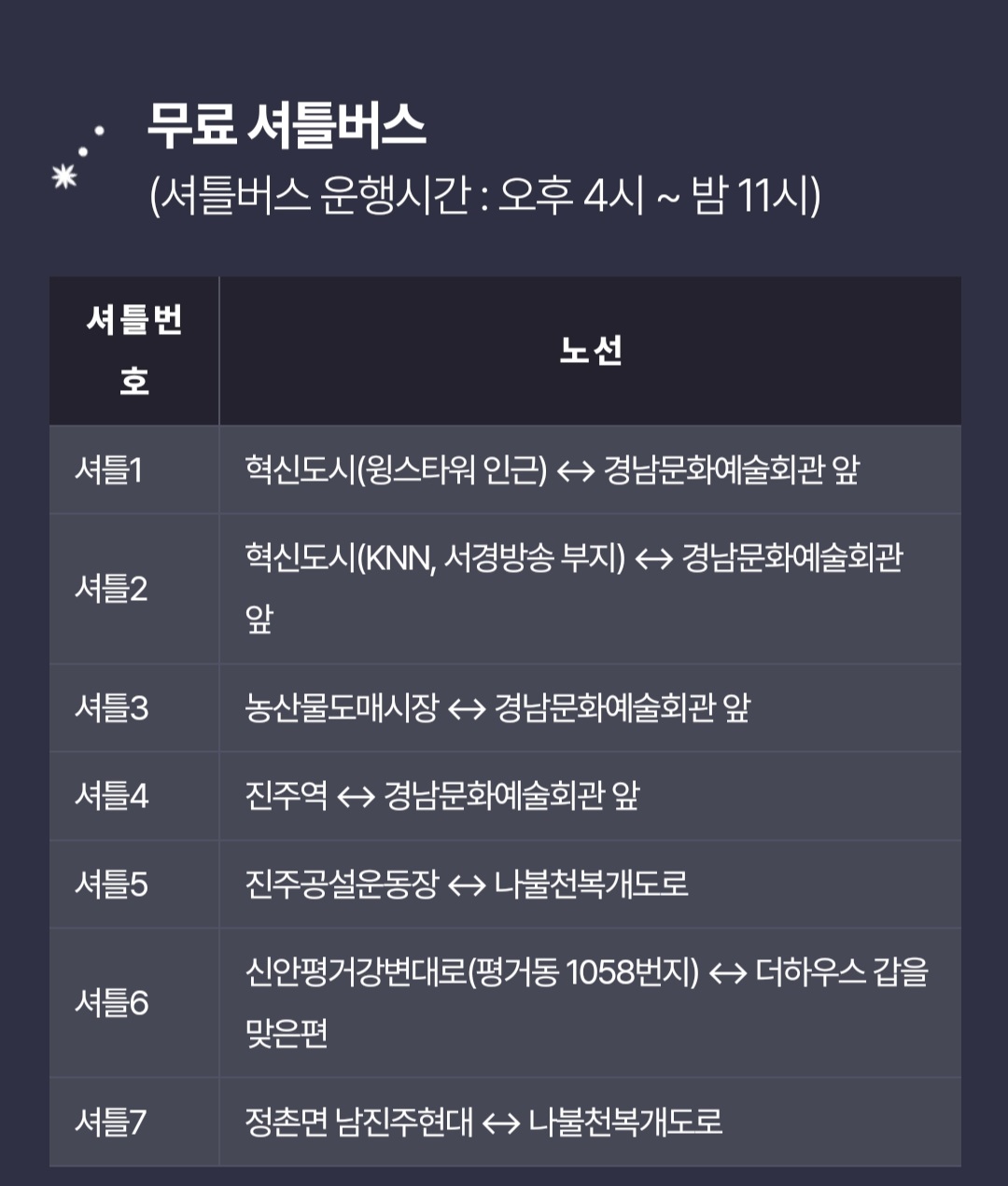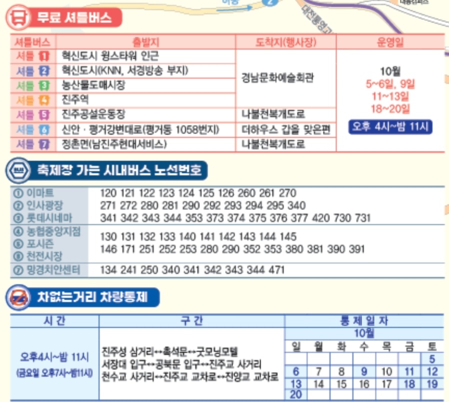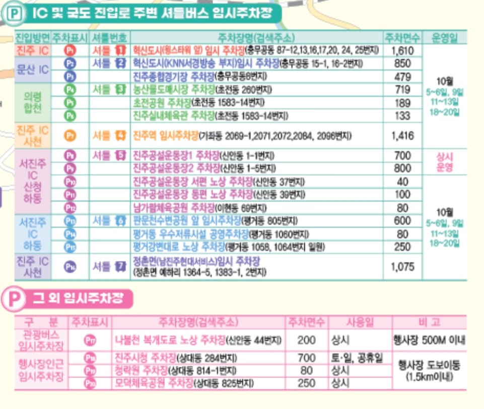 특히 저녁시간에는 행사장주변에 주차가 어렵다고 보시면 됩니다. 그래서 진주시에서 무료셔틀버스를 운행하는데 아래 정보를 확인하시어 교통혼잡을 피하시기 바랍니다.