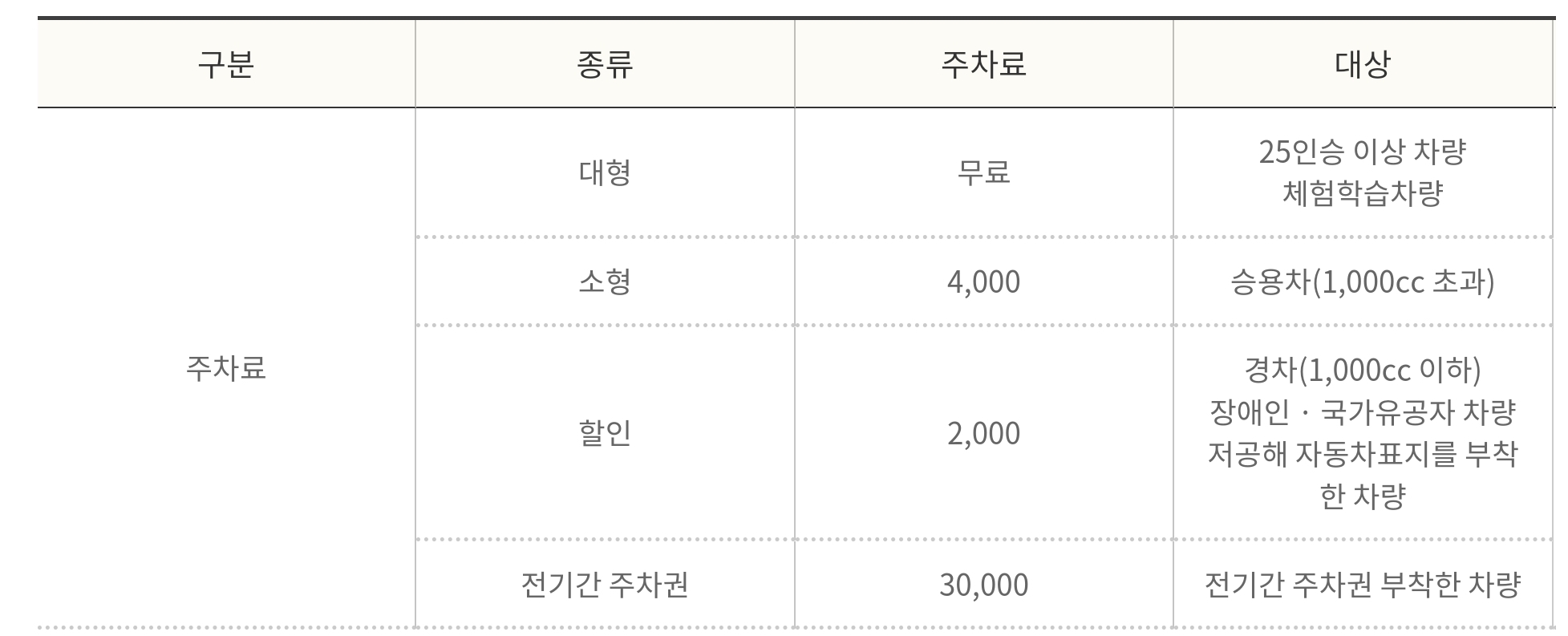 주차요금은 아래표와 같습니다.
