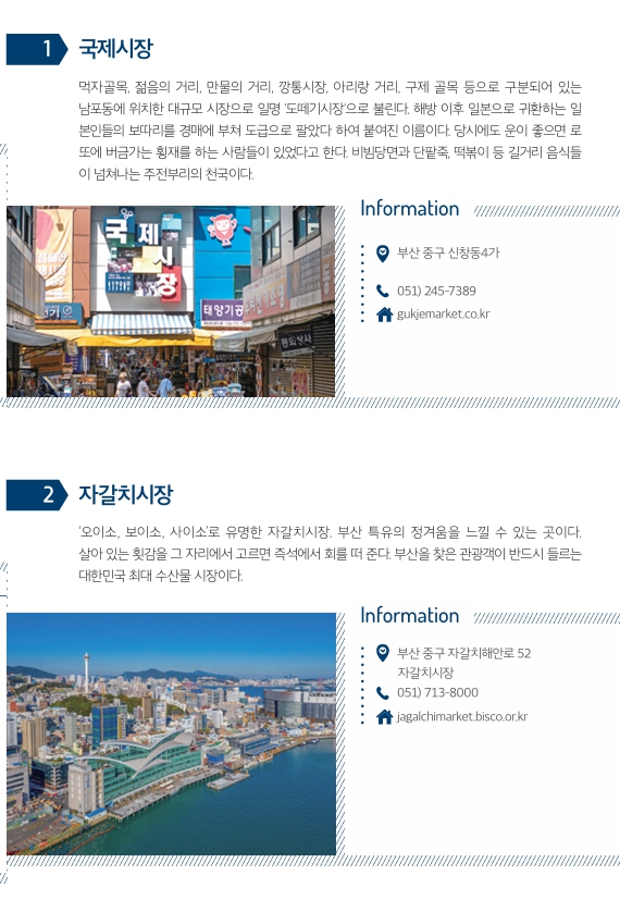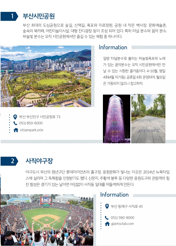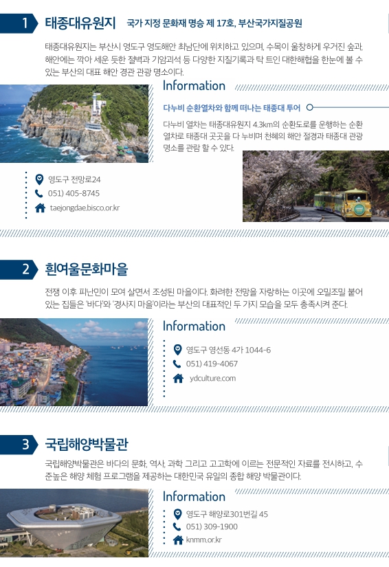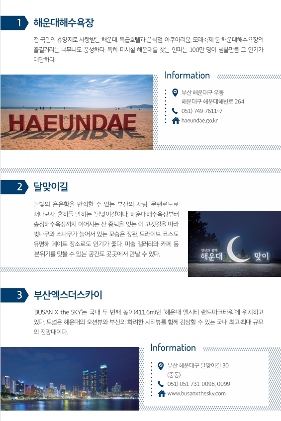 개인적으로 아래 소개 되는 관광지는 거의 다 가봤는데 딱히 어느 한군데가 가장 좋다고 얘기하지 못할 정도로 모두 다 특색있고 좋은 여행지가 될 수 있는 곳들입니다. 아래 부산 여행지 추천 자료한번씩 보시고 취향에 맞는곳을 선택하시면 될거같습니다.