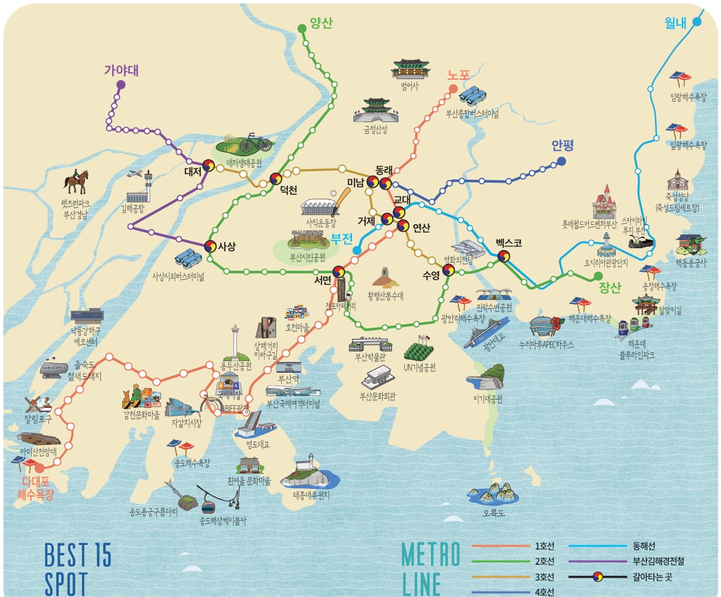 부산이 워낙 관광할 곳이 많아서 어디를 가야할지 고민 되실텐데 부산시에서 추천하는 부산 꼭 가봐야 하는 여행지 깔끔하게 정리된 지도와 여행지 상세 정보입니다. 부산 지하철 노선도는 제일 아래 있습니다.