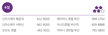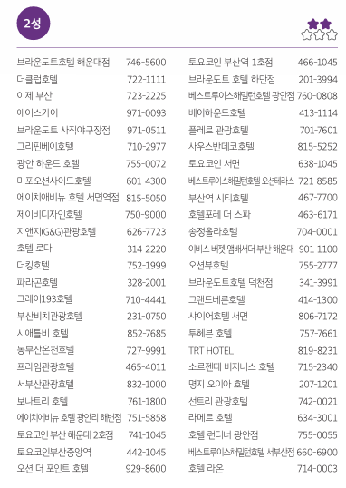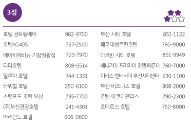 아래 표는 부산에 있는 호텔의 등급을 나타내는 표입니다. 부산 여행시 숙박시설 선택에 참고하시면 됩니다.