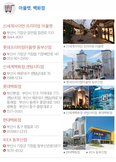 부산에는 규모가 크고 웅장한 아울렛과 백화점도 많이 있어 쇼핑하기도 좋습니다.